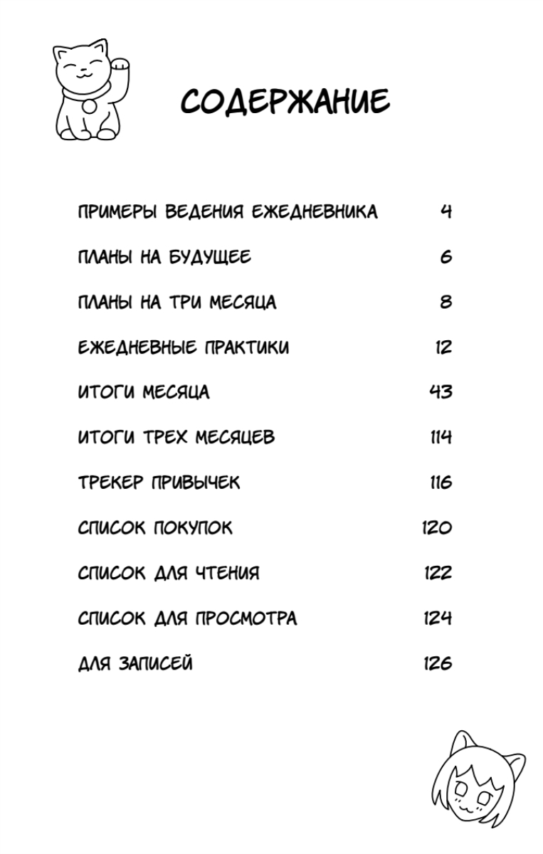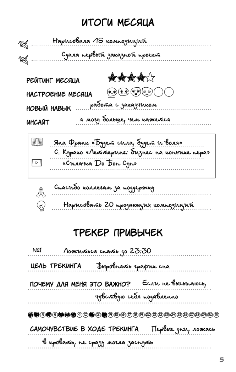 Ежедневник построен на трекинге главных составляющих нашей жизни: погода, мотивация, регулярные занятия, водный баланс, физическая активность, настроение, сон, аффирмации, инсайты, привычки.