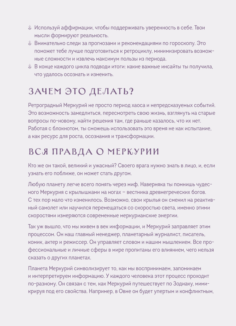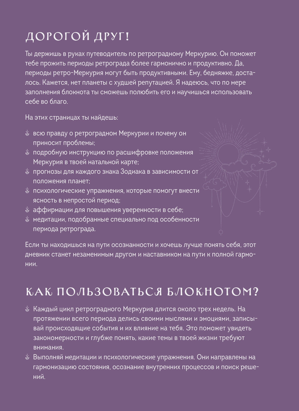 Этот дневник трепетно составлен профессиональным астрологом, чтобы облегчить твой путь. Внутри полное руководство по ретроградным периодам на 2025 и 2026 годы – будь на шаг впереди перемен. А также персональные рекомендации для каждого знака зодиака – адаптируй свою энергию к космическим ритмам. И, конечно медитации для внутренней гармонии и спокойствия. Фиксируй важные мысли и наблюдения