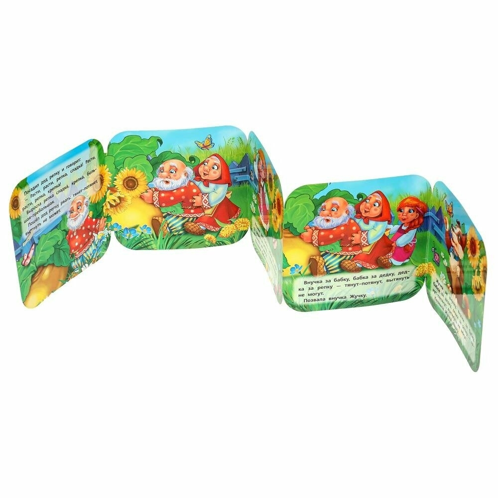 Ребёнок с удовольствием будет разглядывать яркие картинки и слушать интересную сказочную историю, которую ему прочитают взрослые. Страницы книжки, выполненные из картона, собраны в гармошку: их легко листать, а также можно распрямить во всю длину. Благодаря компактному размеру в собранном виде издание удобно брать с собой в путешествие.