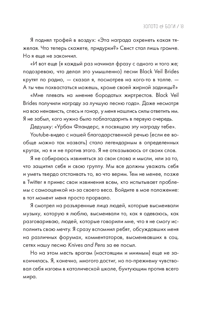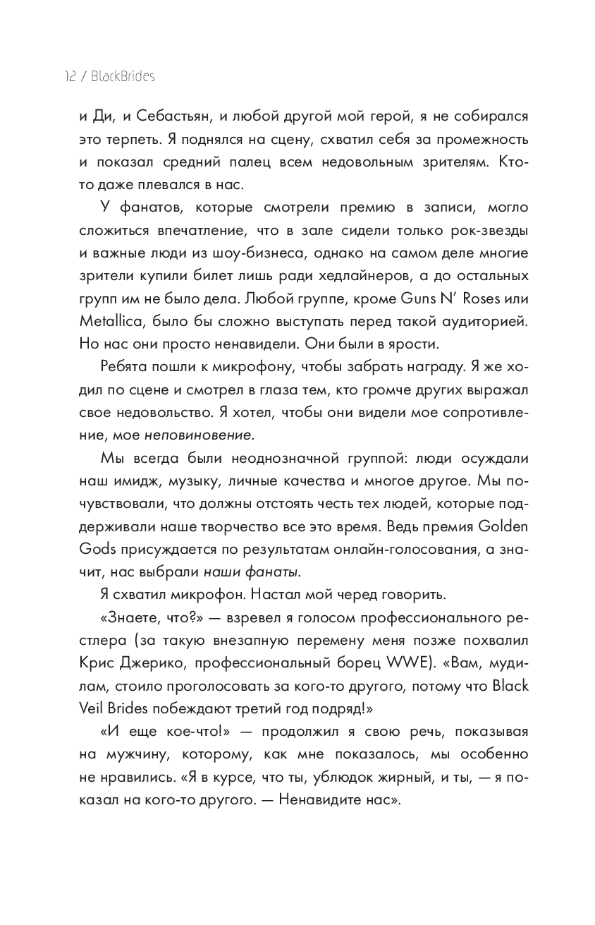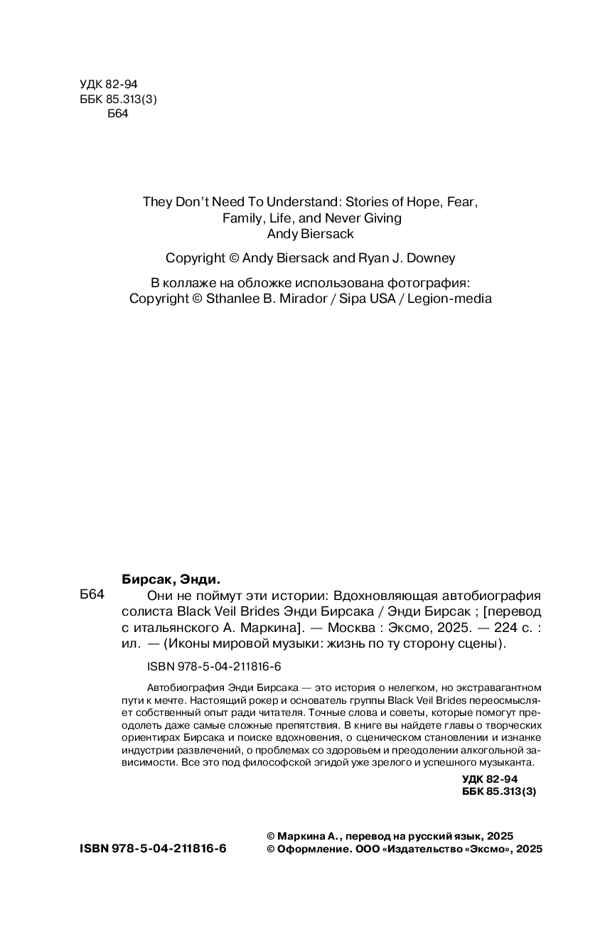 Автобиография Энди Бирсака – это история о нелегком, но экстравагантном пути к мечте. Настоящий рокер и основатель группы "Black Veil Brides" переосмысляет собственный опыт ради читателя. Точные слова и советы, которые помогут преодолеть даже самые сложные препятствия. В книге вы найдете главы о творческих ориентирах Бирсака и поиске вдохновения, о сценическом становлении и изнанке индустрии развлечений, о проблемах со здоровьем и преодолении алкогольной зависимости. Все это под философской эгидой уже зрелого и успешного музыканта.