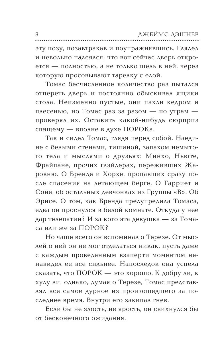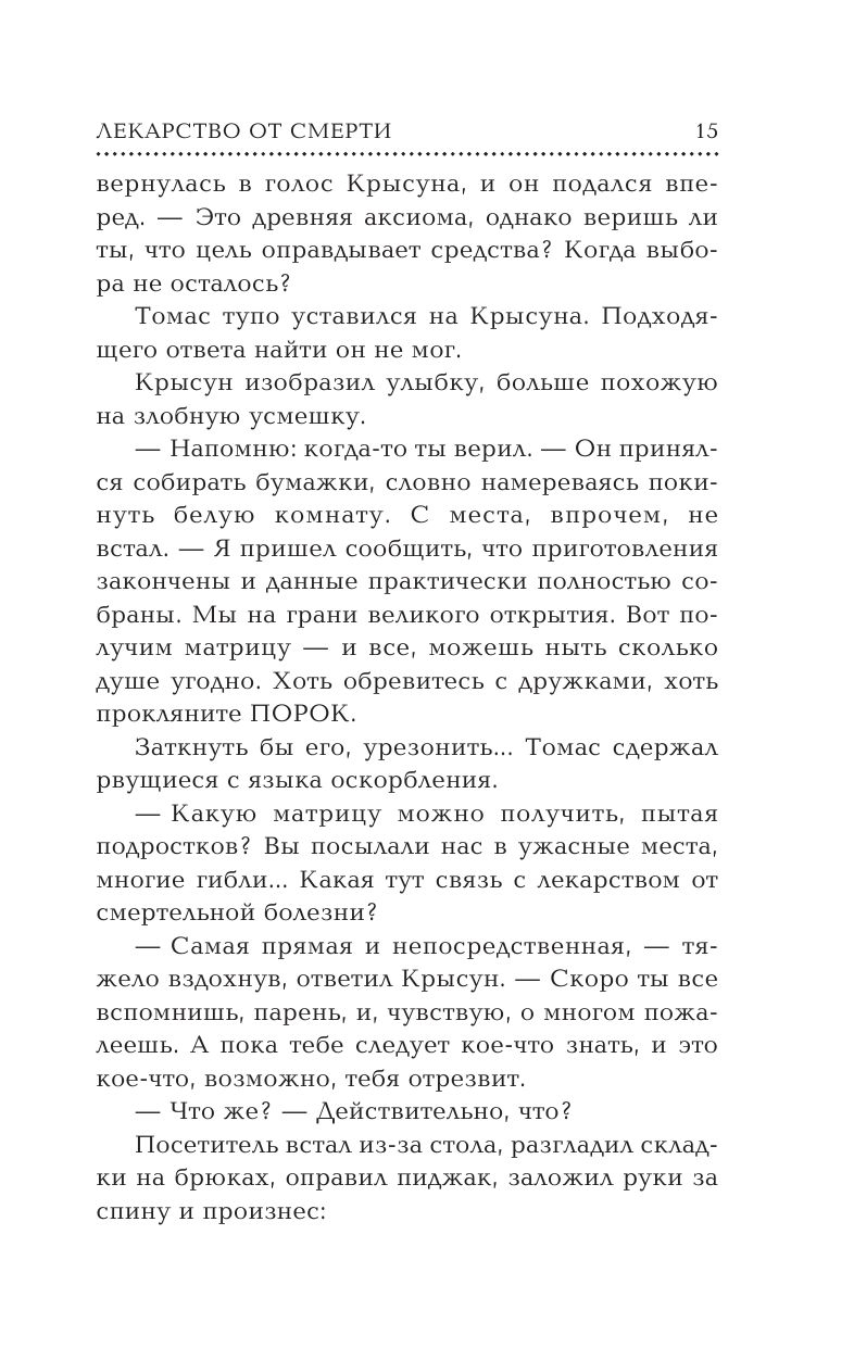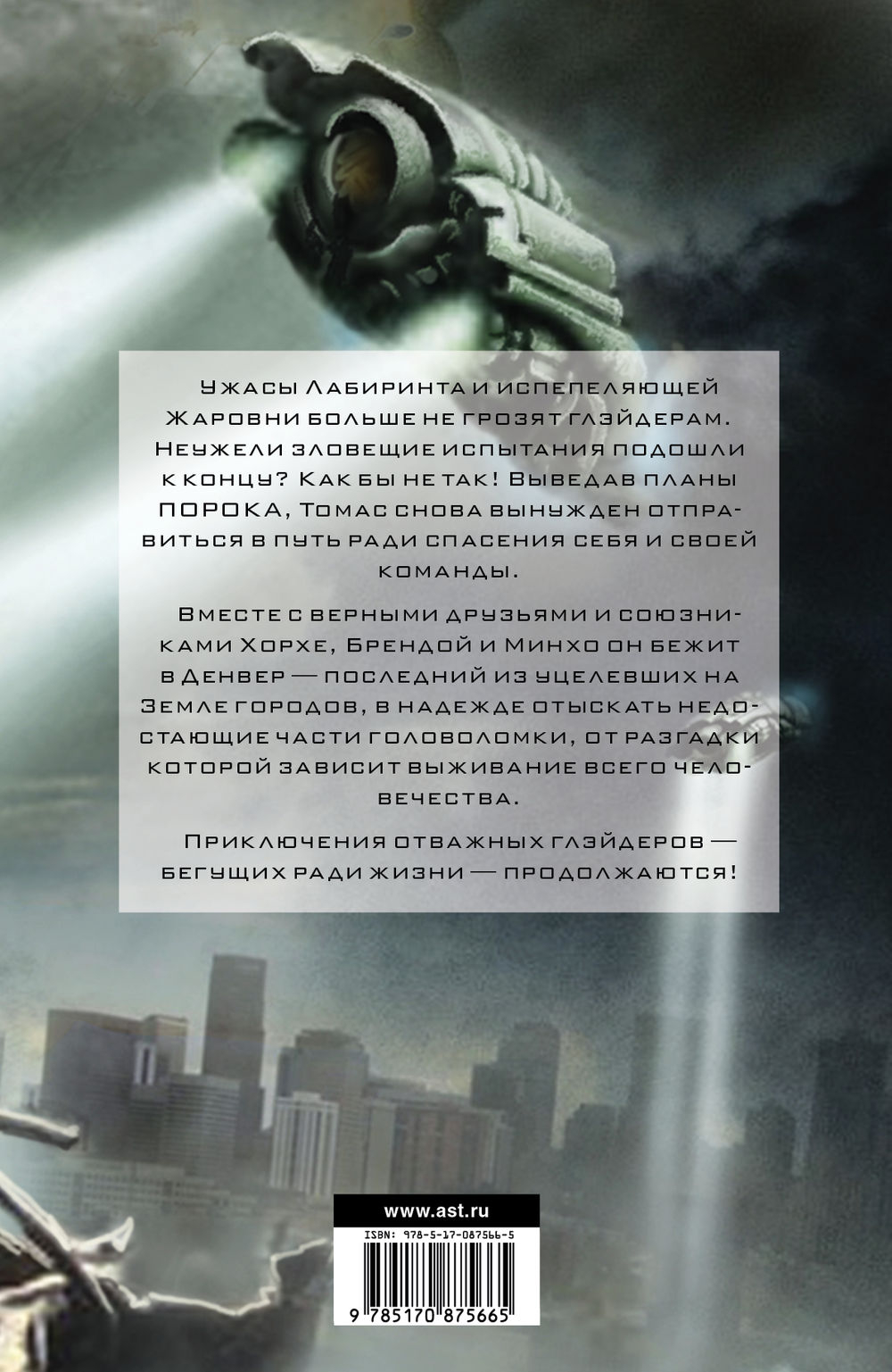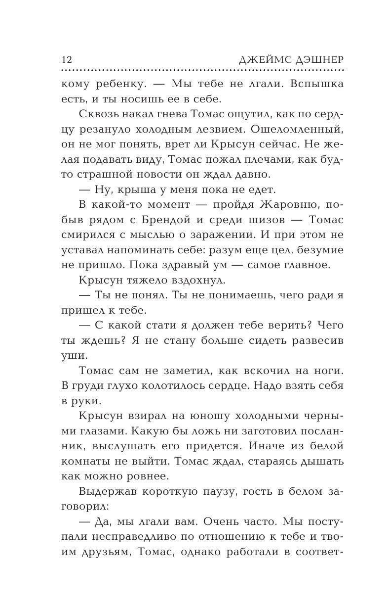 Ужасы Лабиринта и испепеляющей Жаровни больше не грозят грейдерам. Неужели зловещие испытания подошли к концу? Как бы не так! Выведав планы ПОРОКА, Томас снова вынужден отправить-ся в путь ради спасения себя и своей команды. Вместе с верными друзьями и союзниками Хорхе, Брендой и Минхо он бежит в Денвер – последний из уцелевших на Земле городов, в надежде отыскать недостающие части головоломки, от разгадки которой зависит выживание всего человечества. Приключения отважных грейдеров – бегущих ради жизни – продолжаются!
