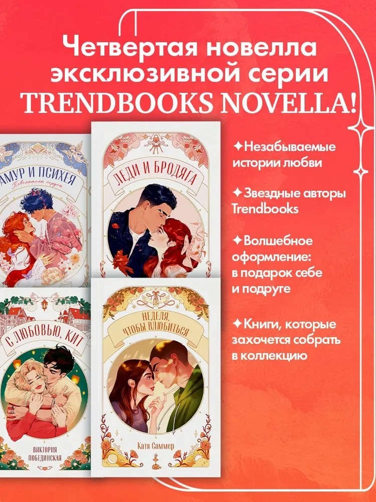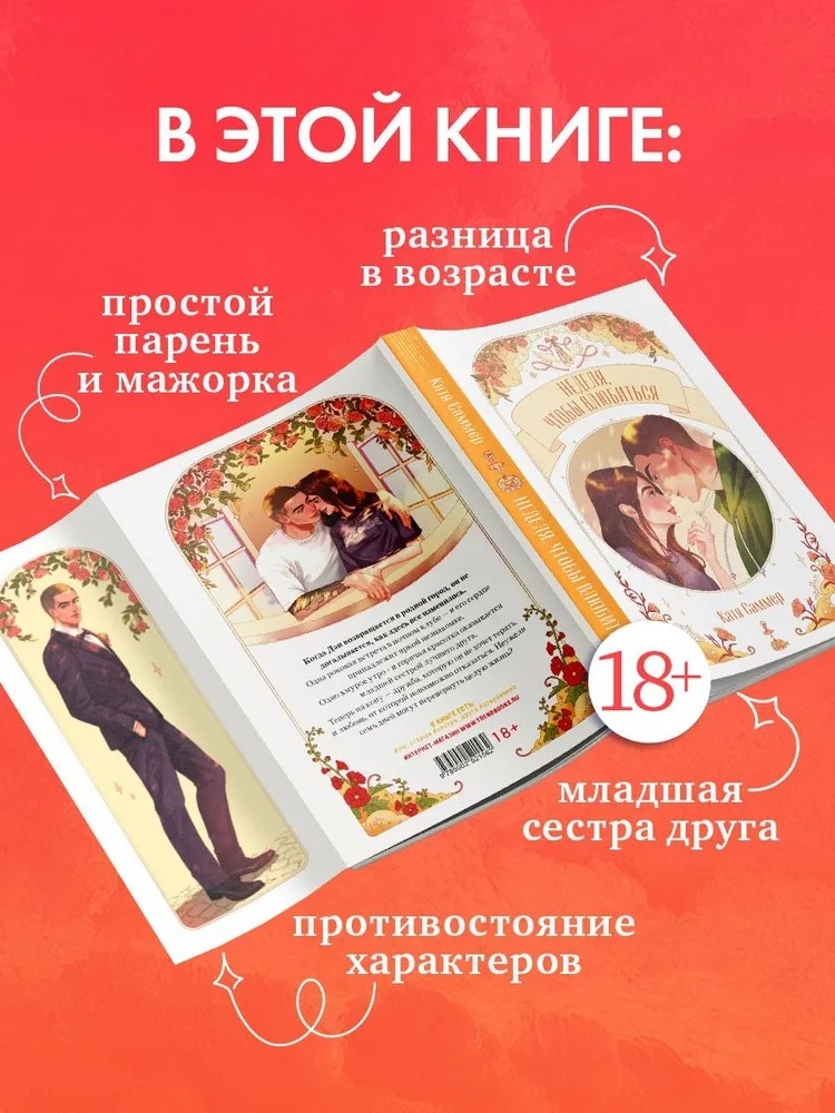"Неделя, чтобы влюбиться" – горячая летняя романтика от Кати Саммер в новой серии Trendbooks Novella. Книга с дизайном обложки от невероятной iroironeri, иллюстрированными клапанами, атмосферным оформлением страниц с печатью в два цвета и, конечно, с захватывающим сюжетом. Новелла, которую направляли читатели с помощью голосований, увлечет с первых строк! Внутри ждет рассказ о дружбе, любви с первого взгляда, долге, чести и выборе.