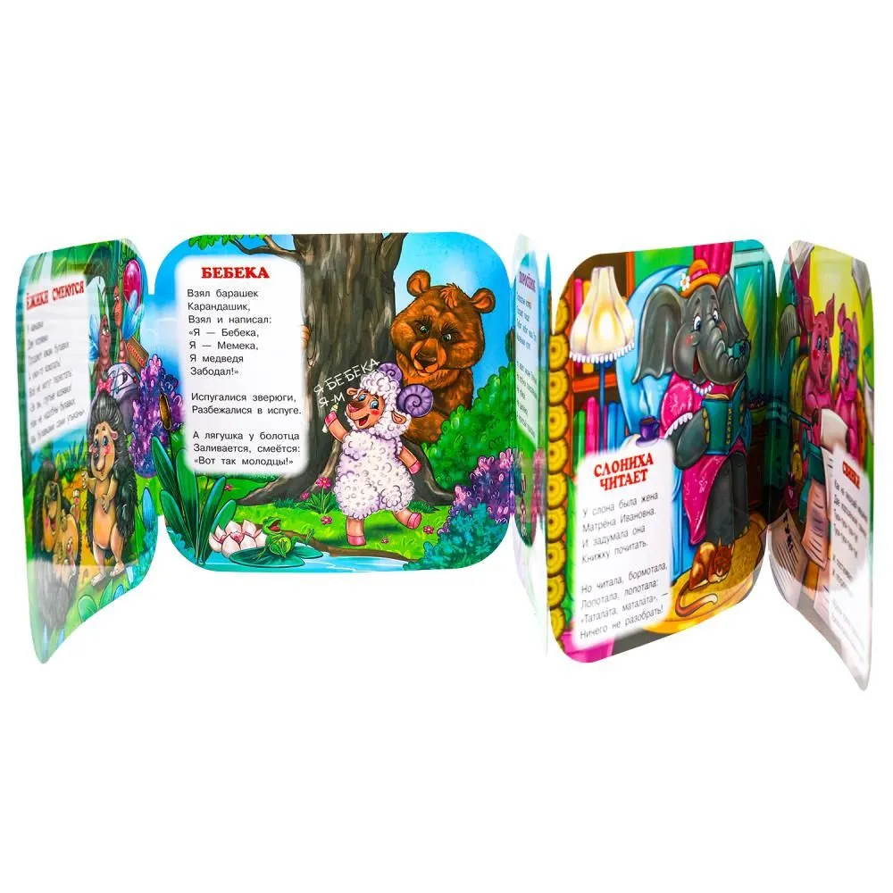 Ребёнок с удовольствием будет разглядывать яркие картинки и слушать известные стихи Корнея Чуковского, которые ему прочитают взрослые. Страницы книжки, выполненные из картона, собраны в гармошку: их легко листать, а также можно распрямить во всю длину. Благодаря компактному размеру в собранном виде издание удобно брать с собой в путешествие.