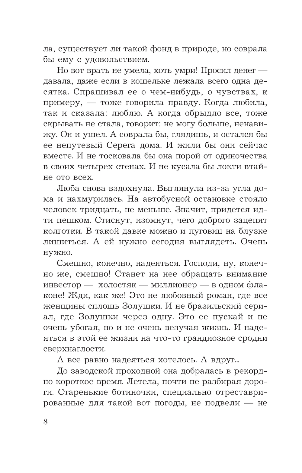 Знала ли скромная сотрудница лаборатории Люба Закатова, чем обернется для нее встреча с заезжим олигархом, купившим контрольный пакет акций их завода? Кольцом с огромным бриллиантом?! Зарплатой в тысячу долларов?! Предложением руки и сердца?! Даже плакать хочется… но не от счастья! Потому что беды посыпались не Любочкину голову: погибает друг юности Тимоша, затем его теща, которая должна была передать девушке какие-то документы. Смерть ходит по пятам и за самой Любой. А тут еще, как назло, появляется "любовь всей ее жизни" – красавец Ким. И с каждым днем крепнет уверенность – он-то и есть виновник всех ее неприятностей…