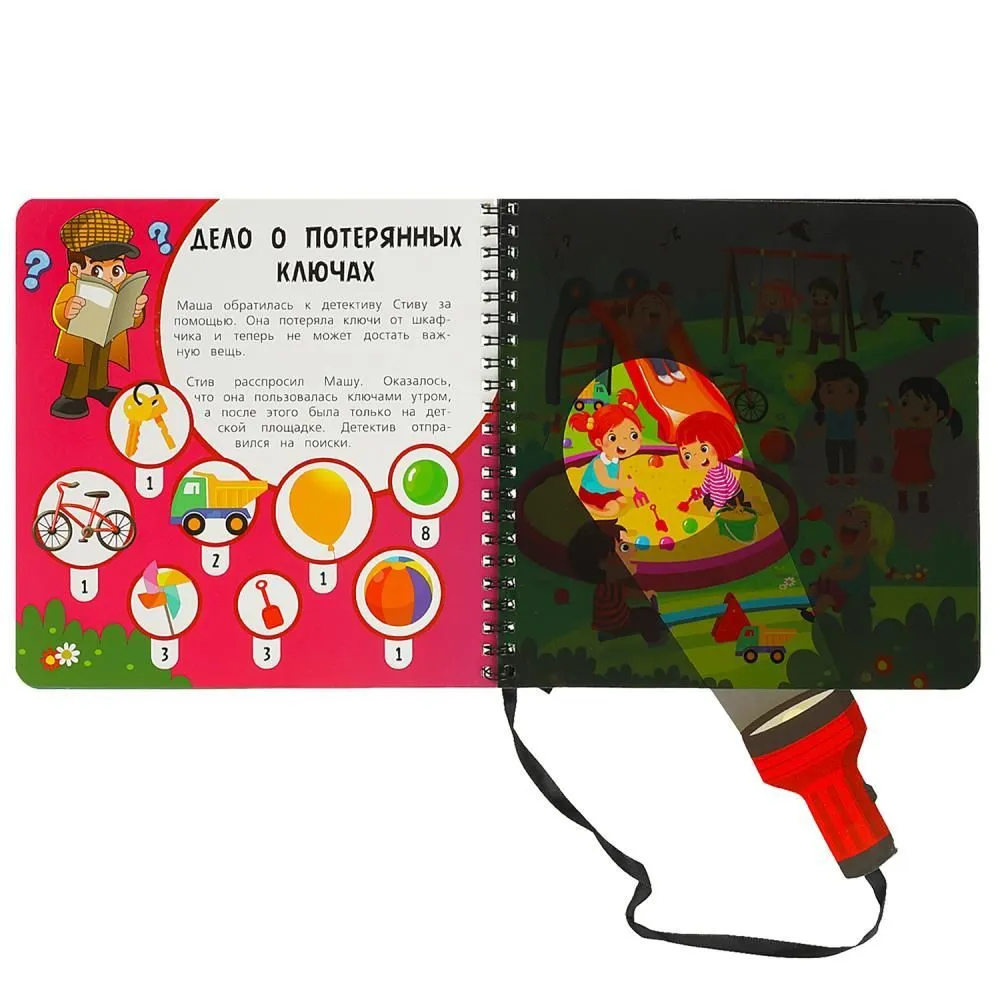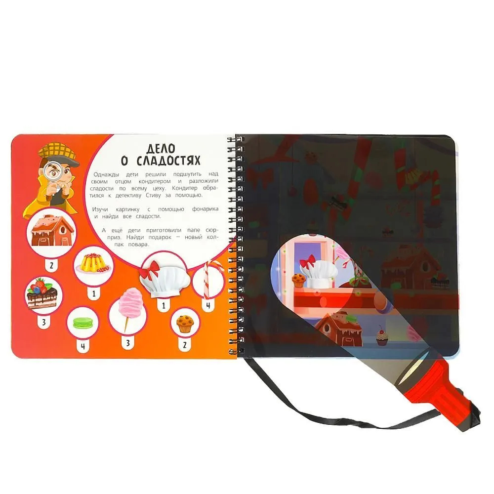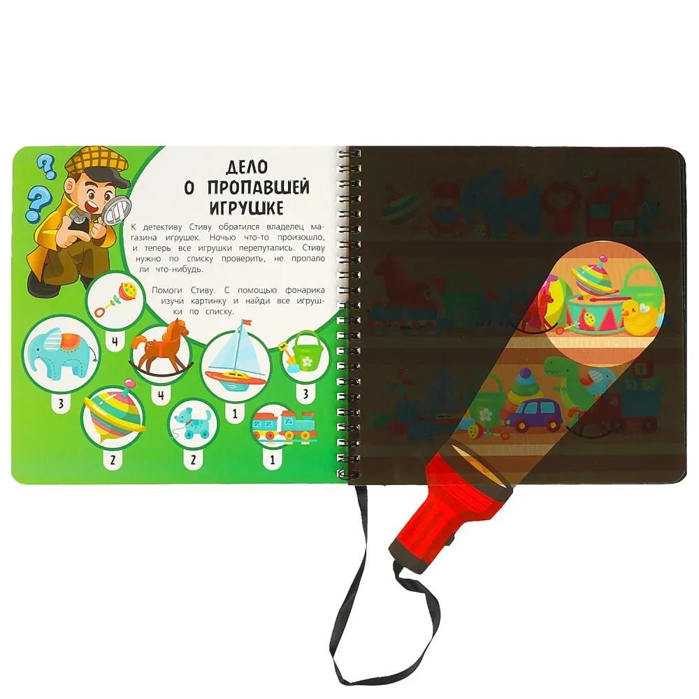 Эта удивительная книжка для тех, кто хочет почувствовать себя настоящим сыщиком, кто любит искать и находить. А поможет в поисках чудо-фонарик: просто поместите его между чёрной и цветной страницами и медленно водите, "подсвечивая" спрятанные на рисунке предметы. Такое увлекательное занятие обязательно понравится ребёнку, он с удовольствием проведёт время с этой книгой, а если позвать друзей, то поиски станут ещё интереснее и веселее!