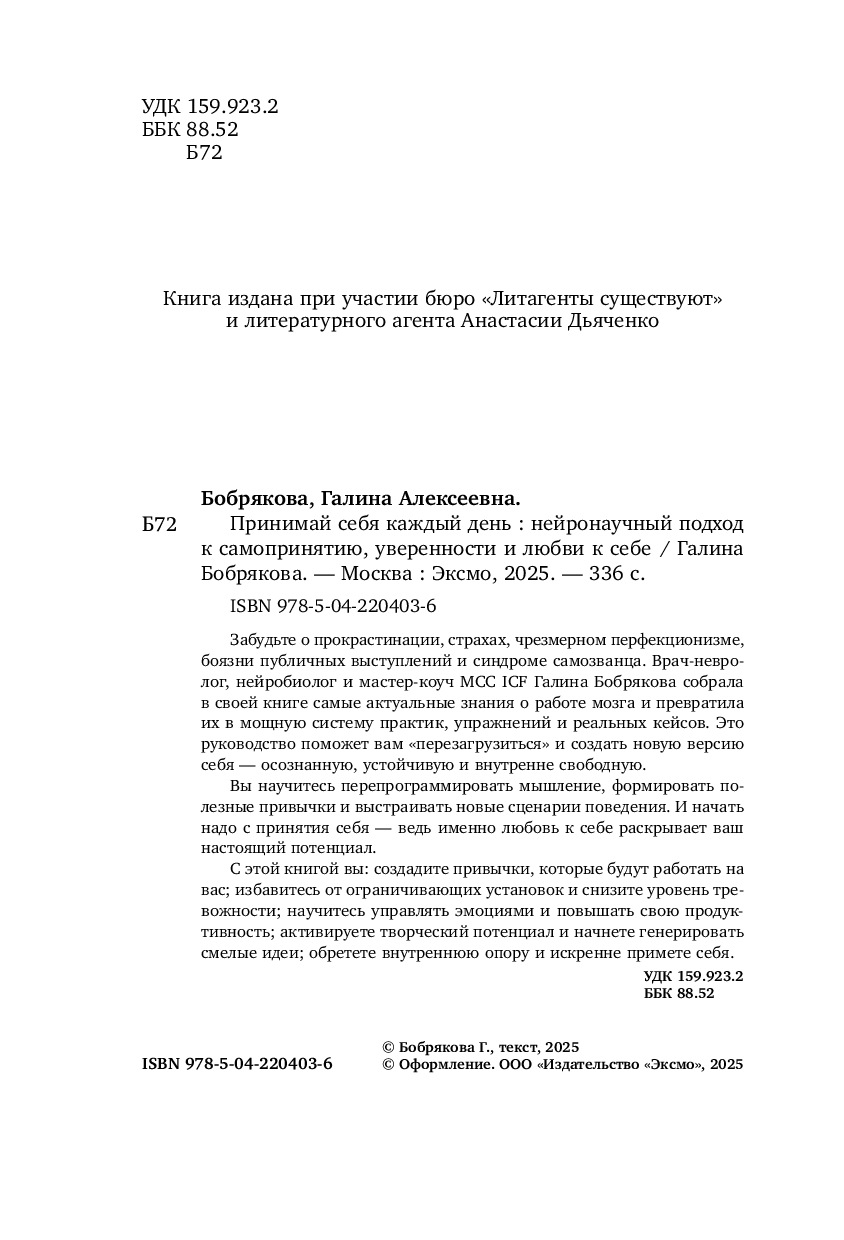 Забудьте о прокрастинации, страхах, чрезмерном перфекционизме, боязни публичных выступлений и синдроме самозванца. Врач-невролог, нейробиолог и мастер-коуч MCC ICF Галина Бобрякова собрала в своей книге самые актуальные знания о работе мозга и превратила их в мощную систему практик, упражнений и реальных кейсов. Это руководство поможет вам "перезагрузиться" и создать новую версию себя – осознанную, устойчивую и внутренне свободную.