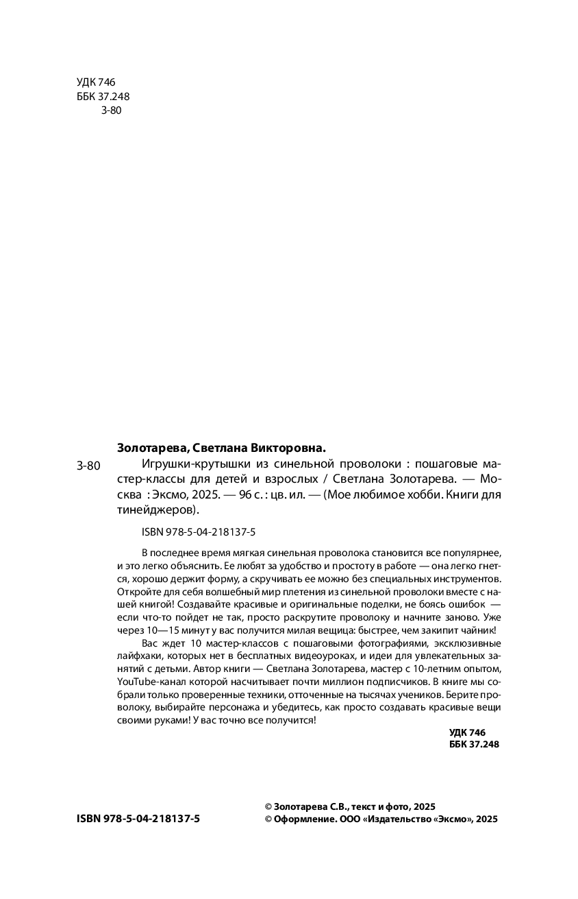 Светлана Золотарёва – мастер с 10-летним опытом, гуру синельной проволоки, превратившая хобби в искусство. АВТОР, КОТОРОМУ ДОВЕРЯЮТ: ее канал на YouTube уже набрал почти миллион подписчиков, ее подробные мастер-классы всегда ждут с нетерпением. В этой книге мы собрали только проверенные, самые эффектные и работающие техники, отточенные на тысячах учеников!