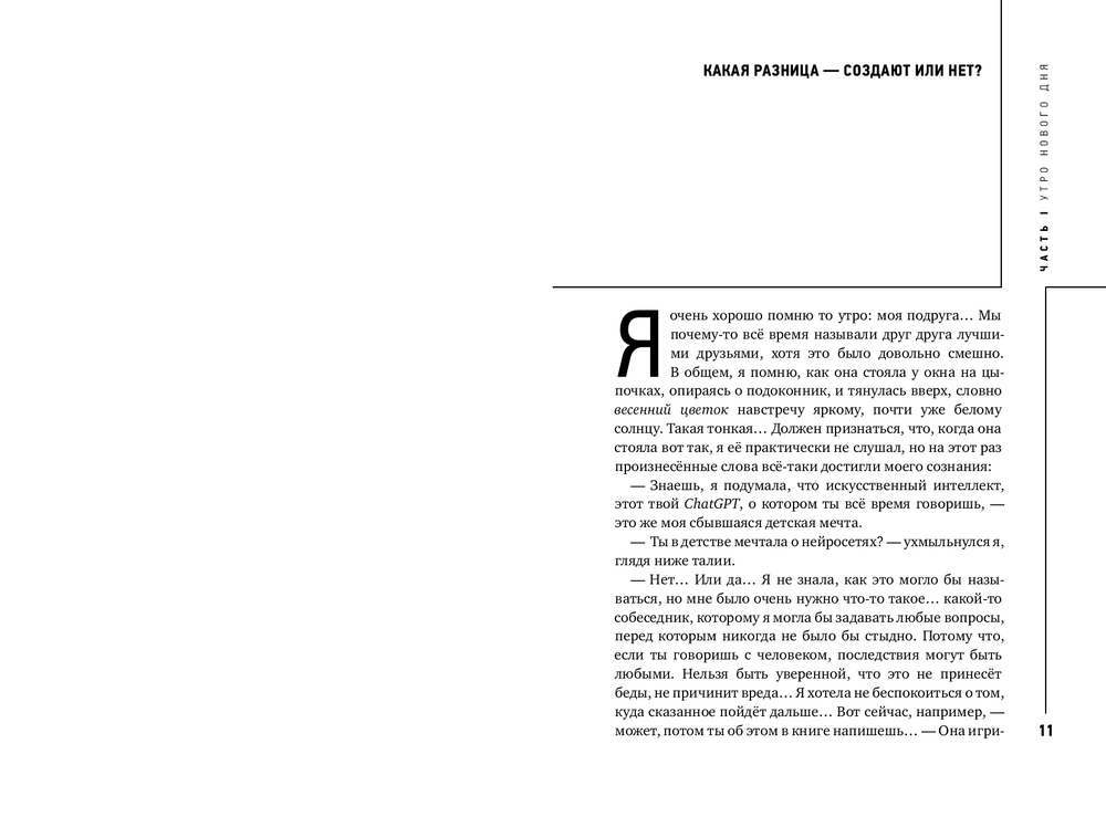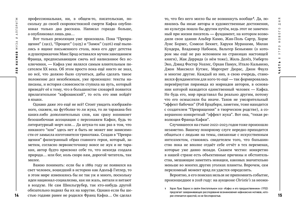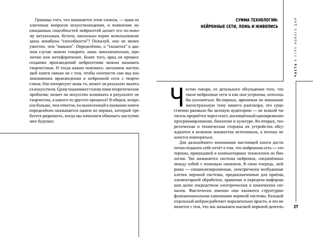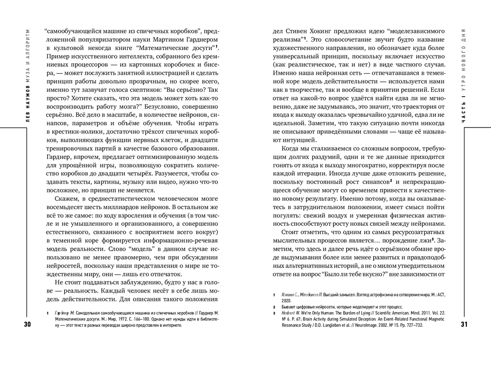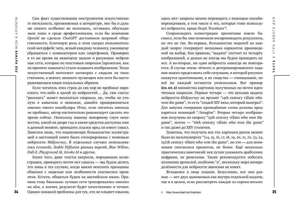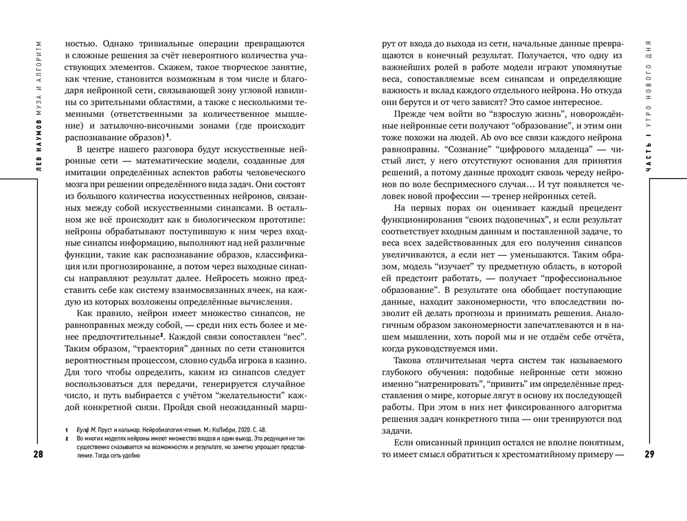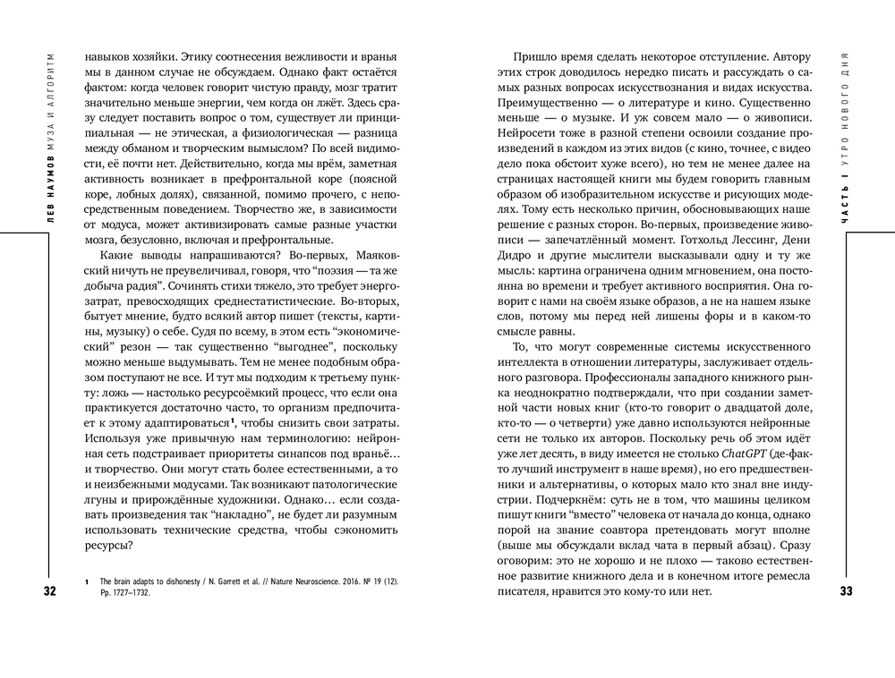 На протяжении веков мысли рождались в муках наводящих вопросов, как это метко описал Платон. Нейросети предлагают нам аналог кесарева сечения: задал вопрос, раз, и ответ готов. Кто-то скажет, что ответ нейросети “совсем не фонтан”. А кто-то возразит, что вполне себе фонтан, если использовать критерий оценки Марселя Дюшана. В этой книге Лев Наумов размышляет над вопросом, как нам относиться к созданному нейросетями. Вступаем ли мы в эпоху нейроклассицизма, ведь для обучения различных больших языковых моделей пока используются только тексты, созданные людьми? Или, напротив, отдаляемся от настоящего творчества? (Полина Кривых, психофизиолог, нейроучёный, CEO Inhound)