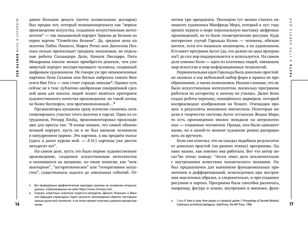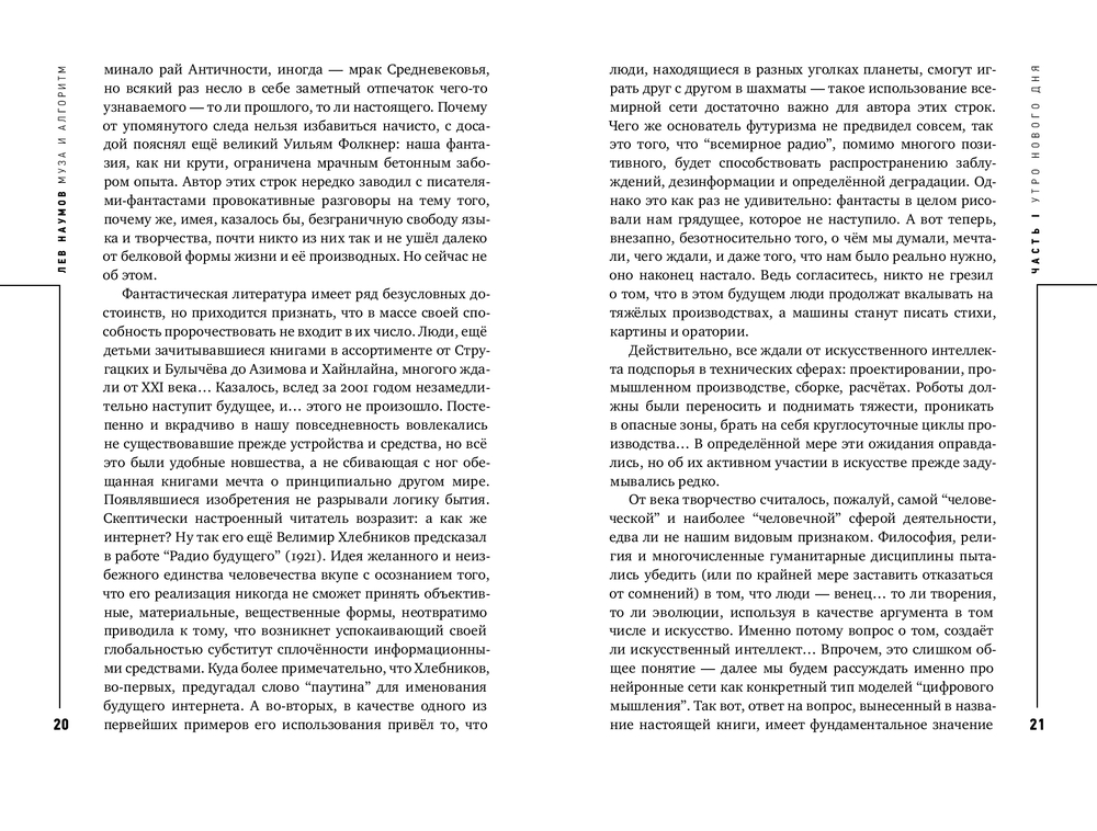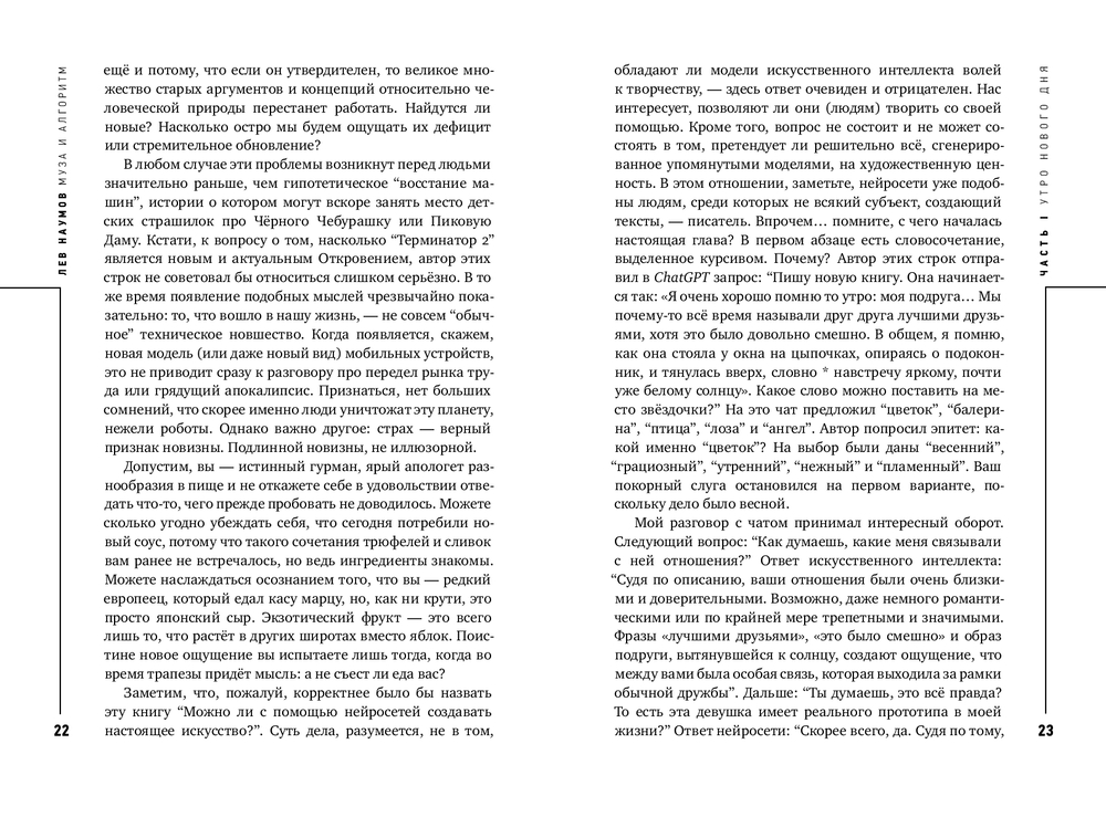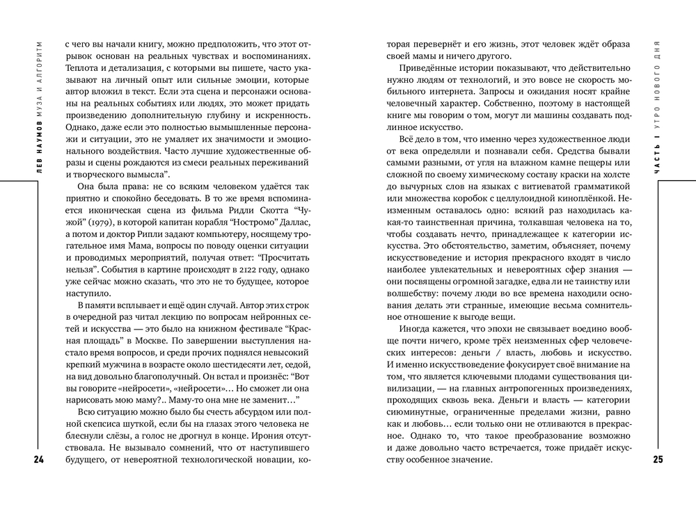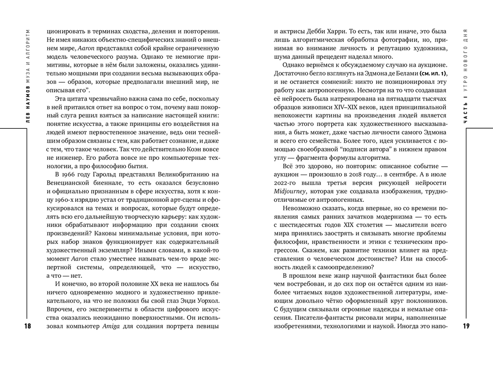 Могут ли нейросети быть художниками или писателями? Эксклюзивно ли создаваемое ими, точнее, с ними? Не вторично ли само искусство? Лев Наумов ищет ответы на эти и другие вопросы, кот орые пока кажутся размытыми, как линии на картинах импрессионистов. Но то, что генеративные модели заставляют нас писать книги о них и вместе с ними – это уже результат синергии, которая неизбежно приведёт к прогрессу и деконструкции прежних форм (Ксения Буржская, прозаик, поэт, AI-евангелист виртуального ассистента Алиса в “Яндексе”).