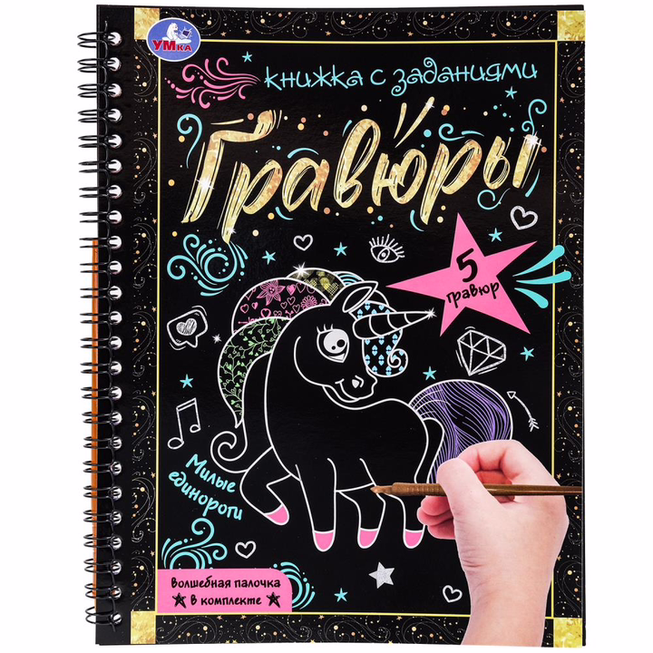 Данное издание представляет собой блокнот на пружинке с красивыми гравюрами и занимательными заданиями. Если провести с помощью волшебной палочки по стираемому слою на специальной странице с чёрным фоном, то на ней проявится рисунок, который можно заштриховать, заполнить его контур, провести отдельные линии. В итоге получится картинка с милыми цветными персонажами. Следуйте за своей фантазией и создавайте потрясающие шедевры!