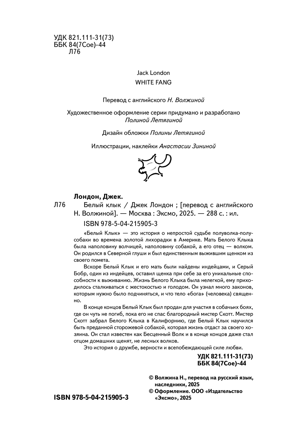 Книга о детстве, отрочестве и юности волка Белый Клык, как назовет его индеец. Повесть – глубокое и увлекательное повествование с испытаниями и философией дикого зверя и домашней сторожевой собаки.