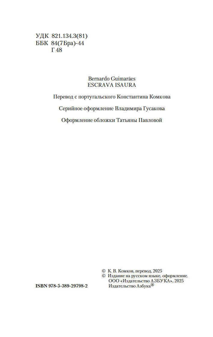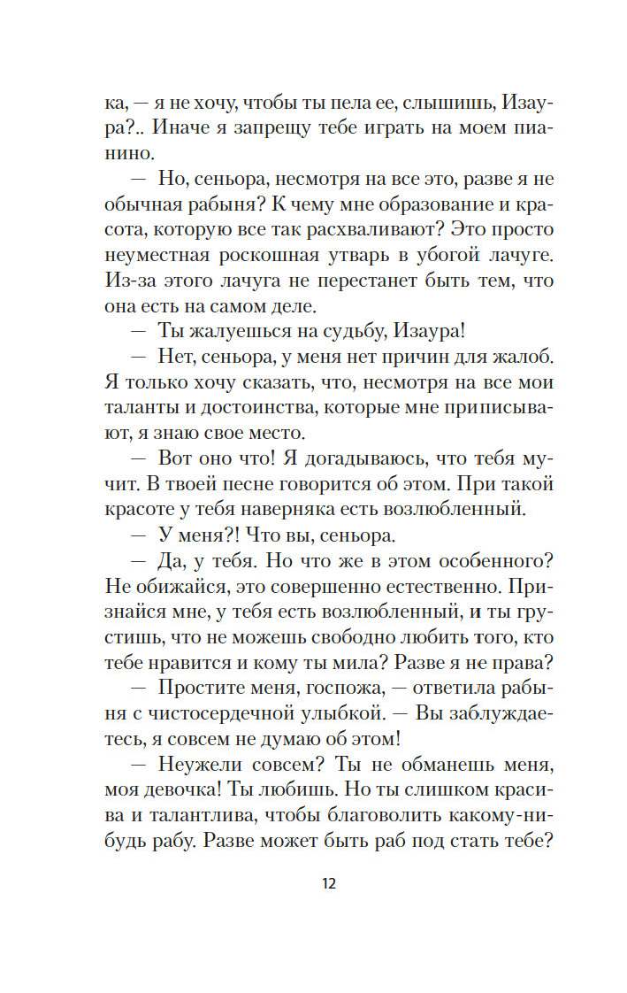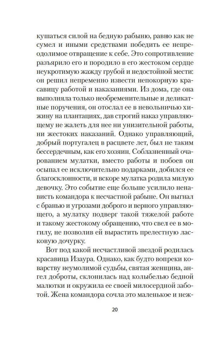 Трогательная история девушки-рабыни, которой пришлось пройти через множество испытаний, прежде чем обрести долгожданную свободу и счастье с любимым человеком, хорошо известна во всем мире. Роман бразильского писателя Бернарду Гимарайнша (1875), проникнутый пафосом защиты человеческого достоинства, в свое время поразил читателей остротой и актуальностью темы: рабство в Бразилии было отменено лишь спустя тринадцать лет после публикации романа. Под влиянием книги, горячего сочувствия к ее главной героине, во многих бразильских семьях девочкам давали имя Изаура. Спустя сто лет роман Бернарду Гимарайнша лег в основу телесериала (1976), который с огромным успехом был показан в разных странах. С тех пор роман "Рабыня Изаура" стал культовым: читателей привлекают в нем не только достоверно показанная жизнь и нравы провинциальной Бразилии середины XIX века, но и счастливый финал – триумф чистой и благородной души.
