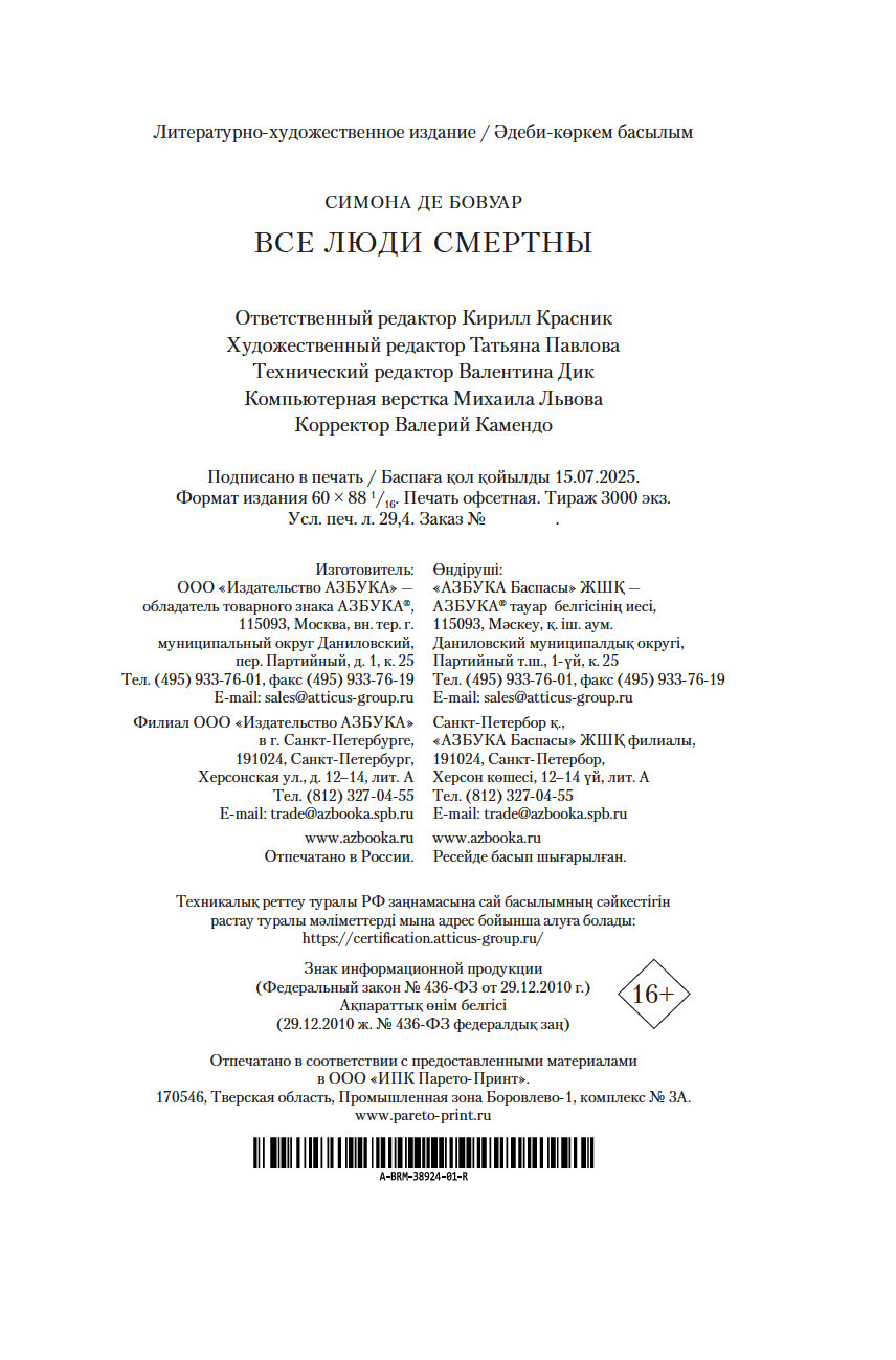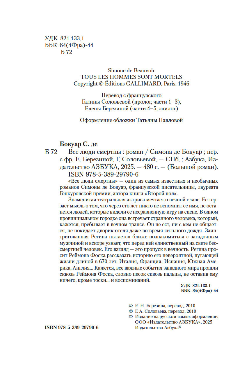 "Все люди смертны" – один из самых известных и необычных романов Симоны де Бовуар, французской писательницы, лауреата Гонкуровской премии, автора книги "Второй пол".