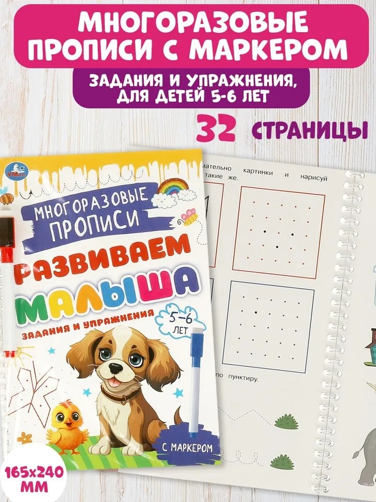 Многоразовые прописи с маркером "Задания и упражнения, для детей 5-6 лет" из серии "Развиваем малыша" – отличный тренажёр для развития графомоторных навыков: