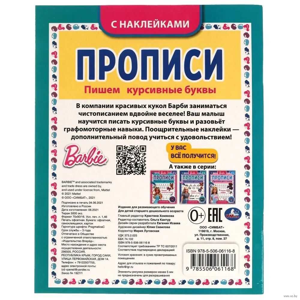 Данная книга с прописями и иллюстрациями-раскрасками с изображением красавицы куклы Барби облегчит процесс обучения ребёнка, поможет ему потренировать руку в написании курсивных букв. А поддерживать интерес к учёбе и хвалить за успехи помогут поощрительные наклейки.