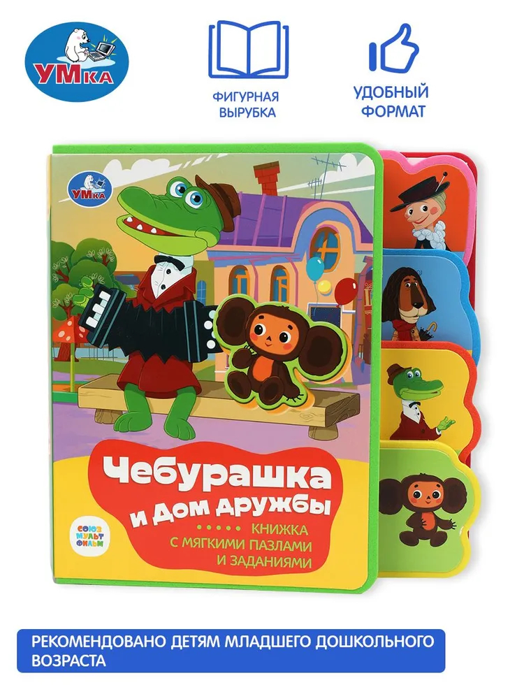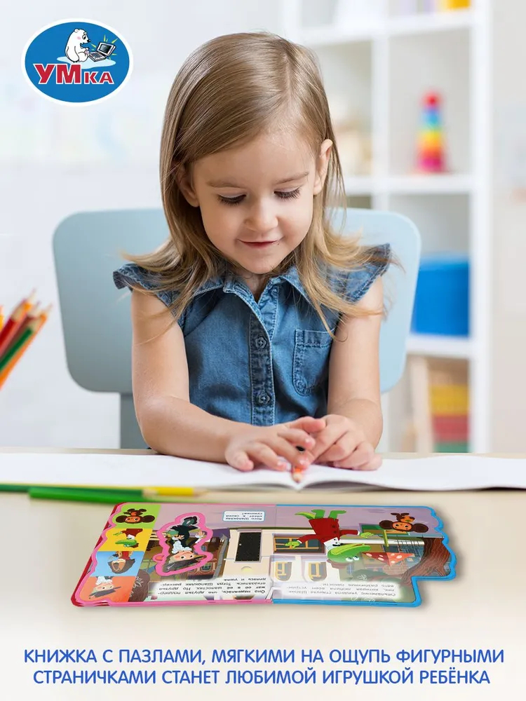 Оригинально оформленная книжка с фигурной вырубкой, яркими страницами и мягким обрамлением обязательно заинтересует маленького любознайку. Ребёнок с удовольствием будет листать книгу с помощью специальных закладок и играть с 5 пазлами-вставками, извлекая их из страниц и помещая обратно. Благодаря компактному формату книжку удобно брать с собой в дорогу.