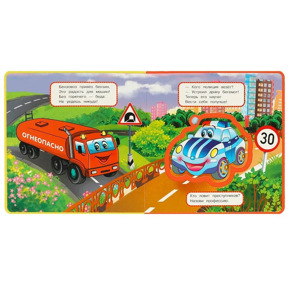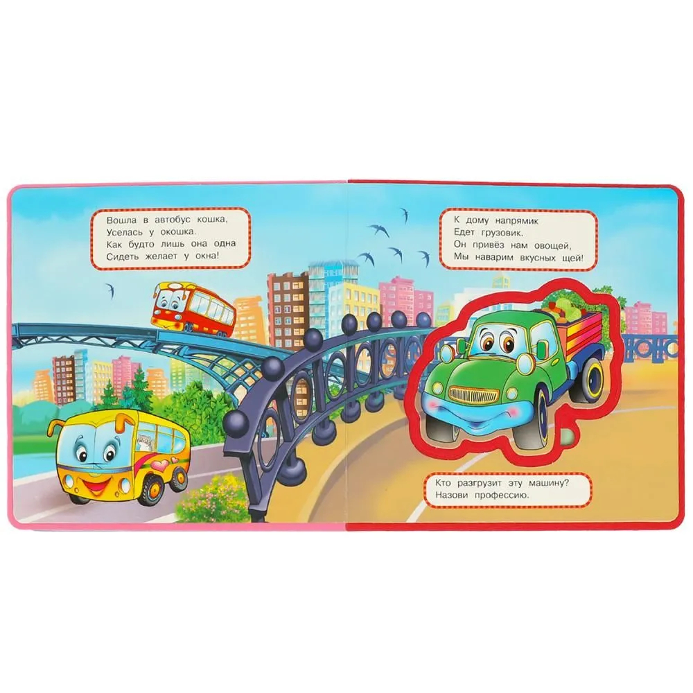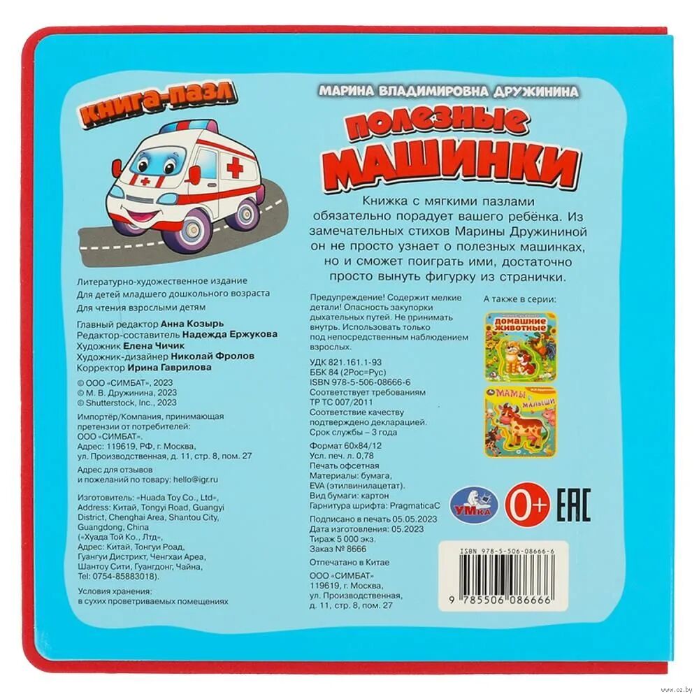 Книжка с пазлами, мягкими и приятными на ощупь страничками понравится малышу и станет его любимой игрушкой. Из замечательных стихов Марины Дружининой он не просто узнает о полезных машинах, но и сможет поиграть ими, достаточно просто вынуть фигурку из странички. Благодаря компактному формату её удобно брать с собой в путешествия. Издание идеально подходит для развития детской сенсорики и мелкой моторики.