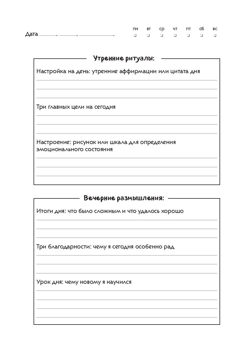 Внутри поля для заполнения утренних мыслей, вечерних размышлений, а также место для оценки своего ментального состояния и заметок.