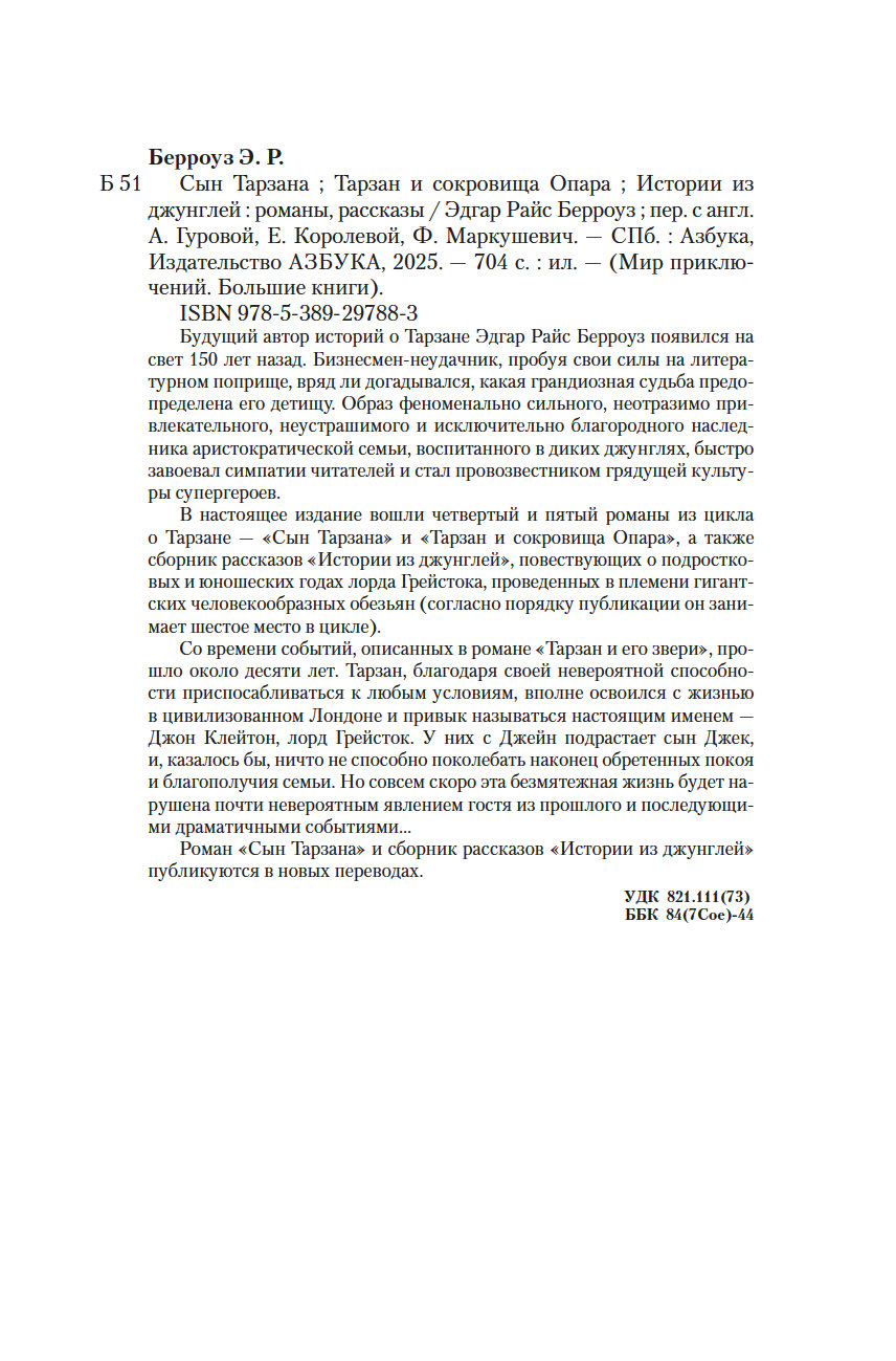 В настоящее издание вошли четвертый и пятый романы из цикла о Тарзане – "Сын Тарзана" и "Тарзан и сокровища Опара", а также сборник рассказов "Истории из джунглей", повествующих о подростковых и юношеских годах лорда Грейстока, проведенных в племени гигантских человекообразных обезьян (согласно порядку публикации он занимает шестое место в цикле).
