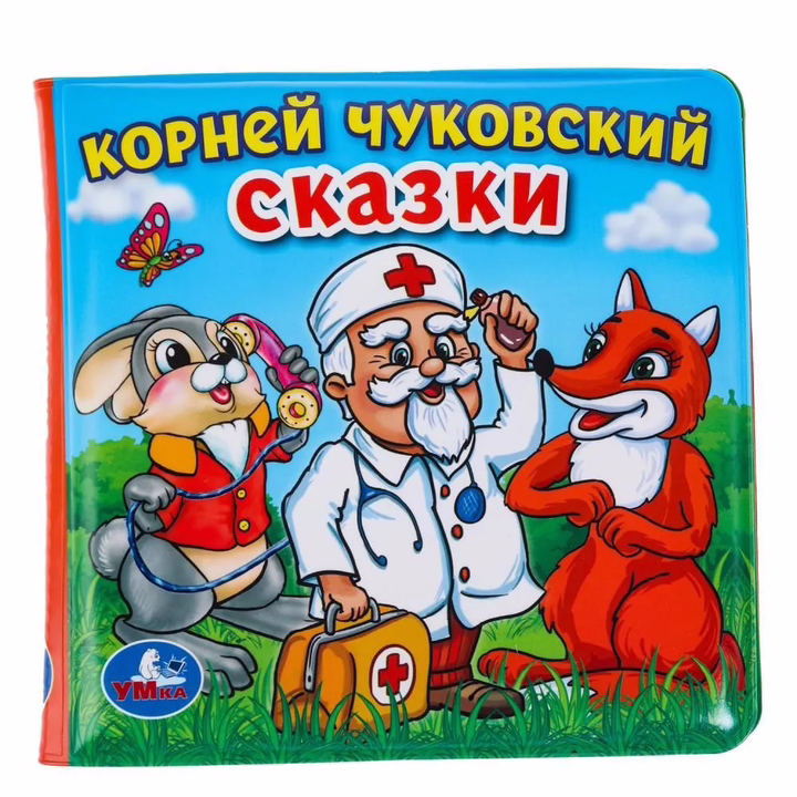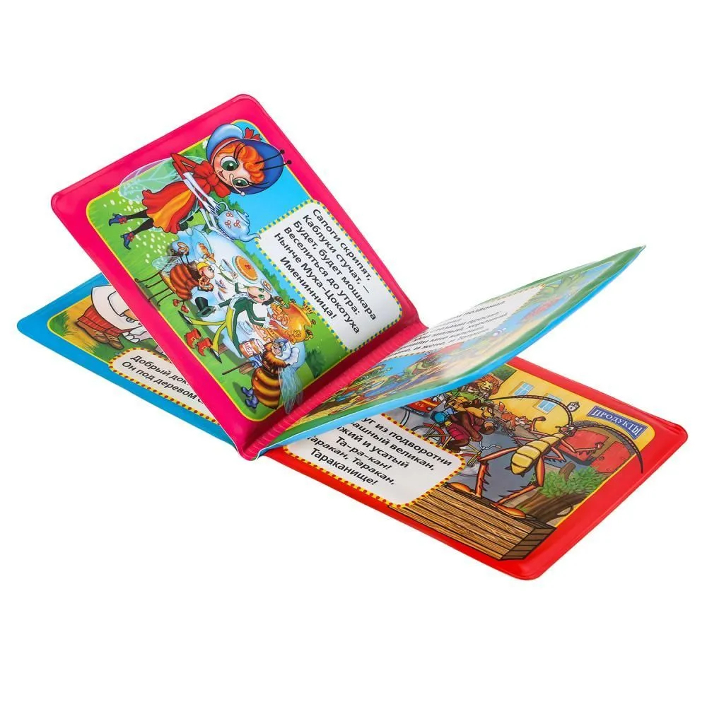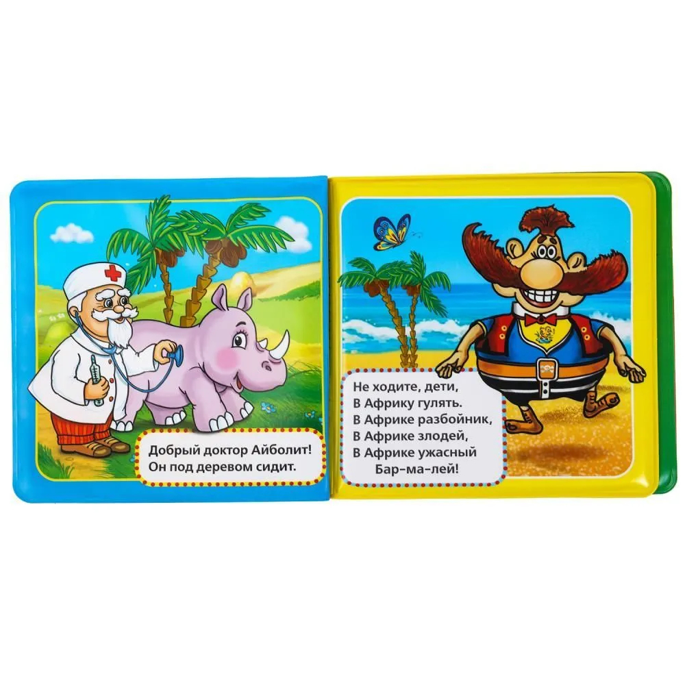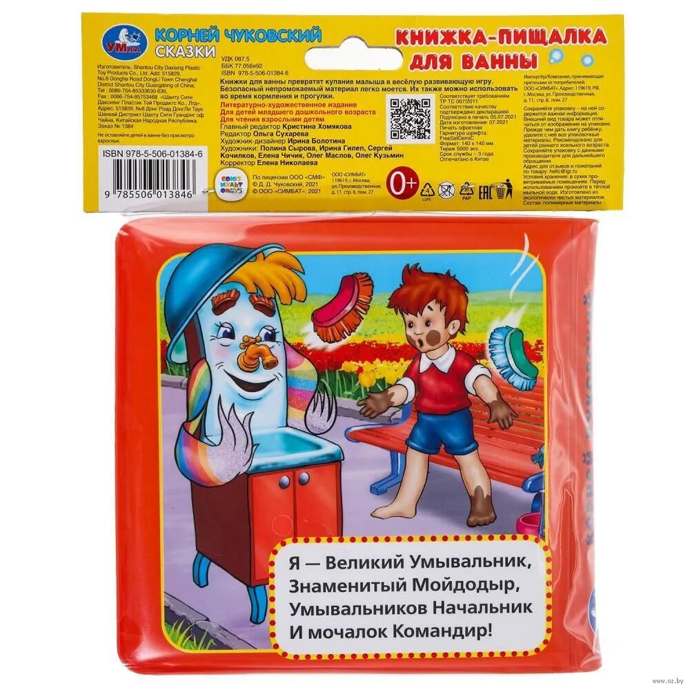 Книга с красочными изображениями персонажей известных произведений К. И. Чуковского обязательно заинтересует малыша. Кроме того, она сможет развеселить маленького непоседу тем, что при нажатии на страницу издаёт забавный пищащий звук. С такой игрушкой ребёнку будет весело и интересно принимать ванну, а также её можно использовать во время кормления или прогулок: непромокаемый материал легко моется.