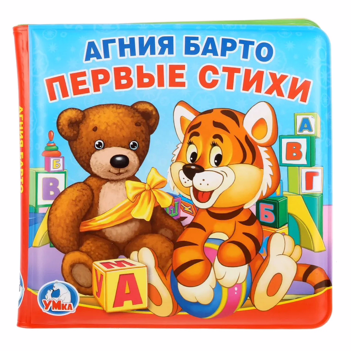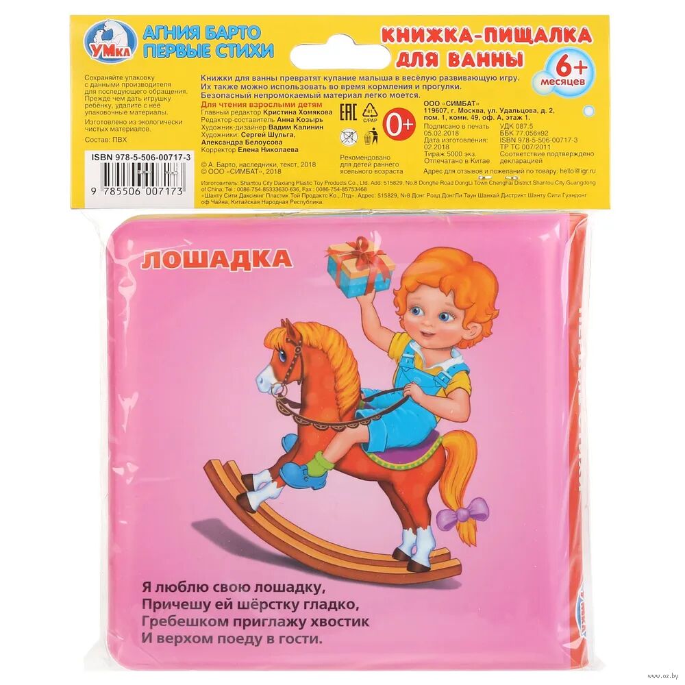 Книга со стихами Агнии Барто и красочными изображениями персонажей из этих произведений обязательно заинтересует малыша. Кроме того, она сможет развеселить маленького непоседу тем, что при нажатии на страницу издаёт забавный пищащий звук. С такой игрушкой ребёнку будет весело и интересно принимать ванну, а также её можно использовать во время кормления или прогулок: непромокаемый материал легко моется.