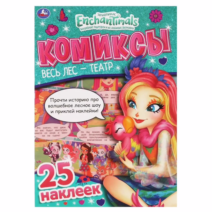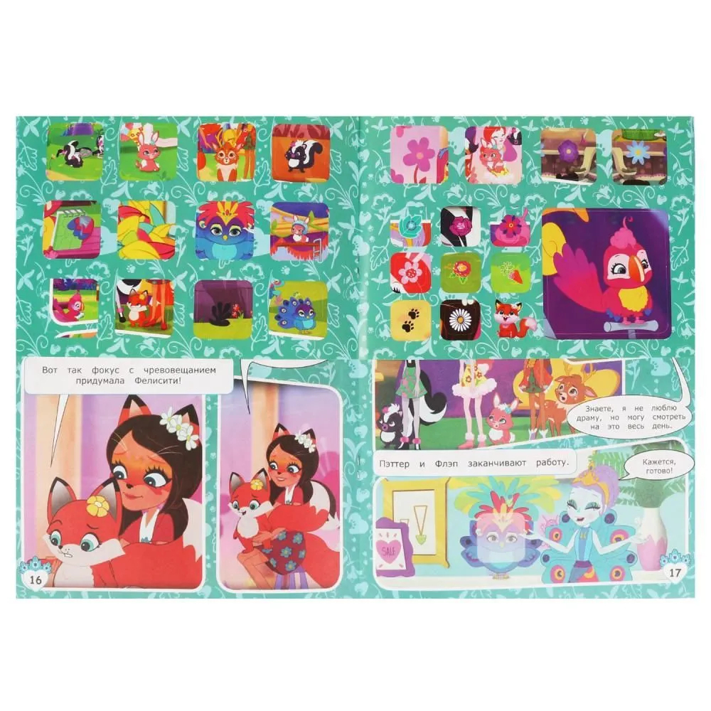 Эти увлекательные комиксы, состоящие практически из одних картинок с минимальным количеством текста, приглашают детей окунуться в удивительный мир, где живут герои любимого мультфильма. Такой формат непременно заинтересует ребёнка, он с удовольствием будет читать историю про волшебное лесное шоу, оформленную яркими иллюстрациями с изображением любимых персонажей, и наклеивать яркие стикеры.