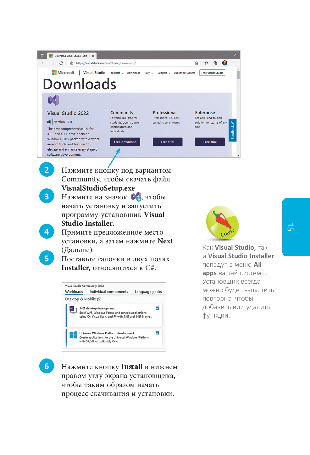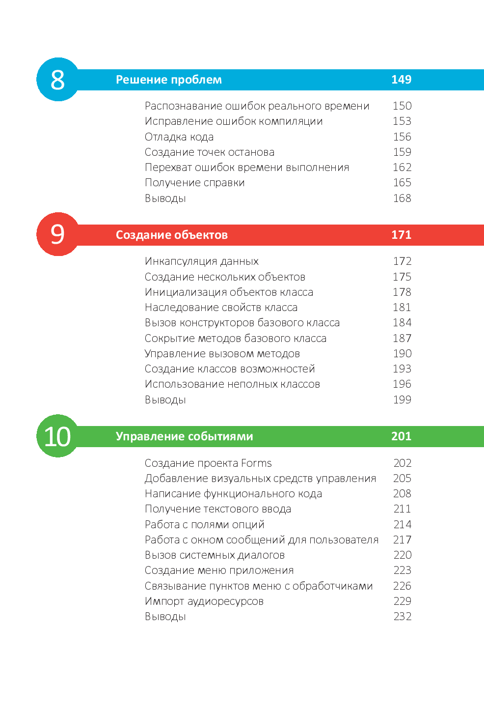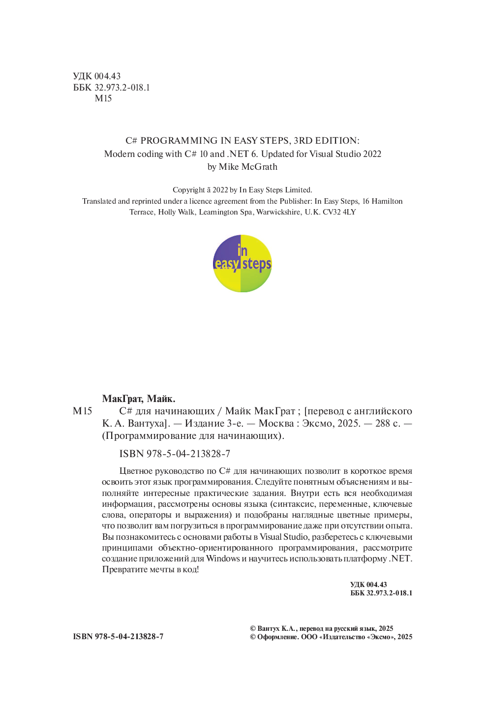 Цветное руководство по C# для начинающих позволит в короткое время освоить этот язык программирования. Следуйте понятным объяснениям и выполняйте интересные практические задания. Внутри есть вся необходимая информация, рассмотрены основы языка (синтаксис, переменные, ключевые слова, операторы и выражения) и подобраны наглядные цветные примеры, что позволит вам погрузиться в программирование даже при отсутствии опыта. Вы познакомитесь с основами работы в Visual Studio, разберетесь с ключевыми принципами объектно-ориентированного программирования, рассмотрите создание приложений для Windows и научитесь использовать платформу .NET. Превратите мечты в код!