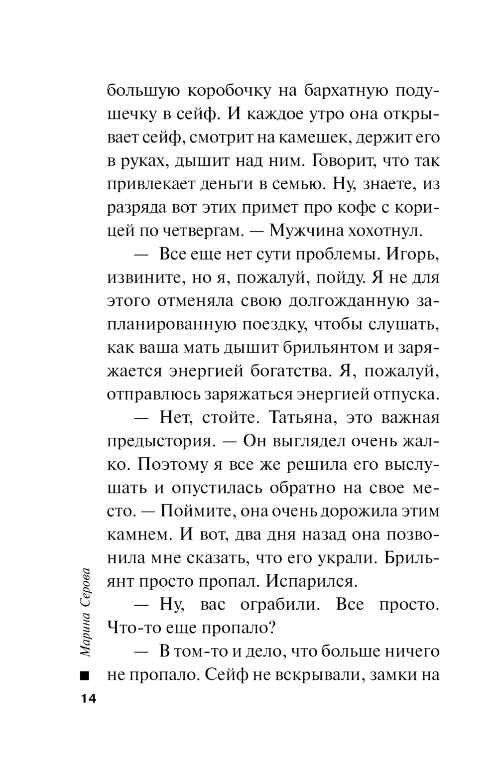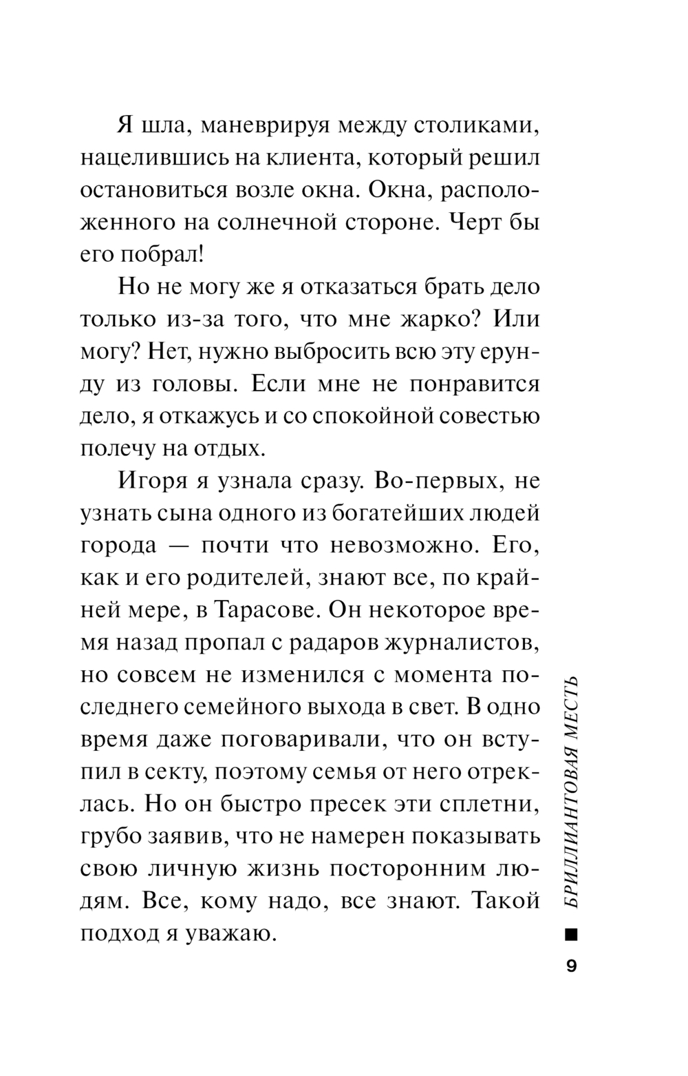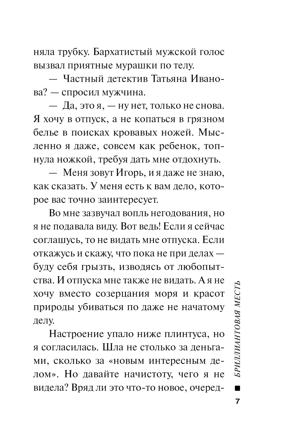 Частный детектив Татьяна Иванова изнывала от жары и ничегонеделания, потому безумно обрадовалась новому расследованию – к ней обратился Игорь Костров с просьбой найти исчезнувший бриллиант из сейфа своей матери. Игорь еще не знал, что во время поисков драгоценного камня Таня Иванова обнаружит и тело его убитого отца-бизнесмена Кострова…