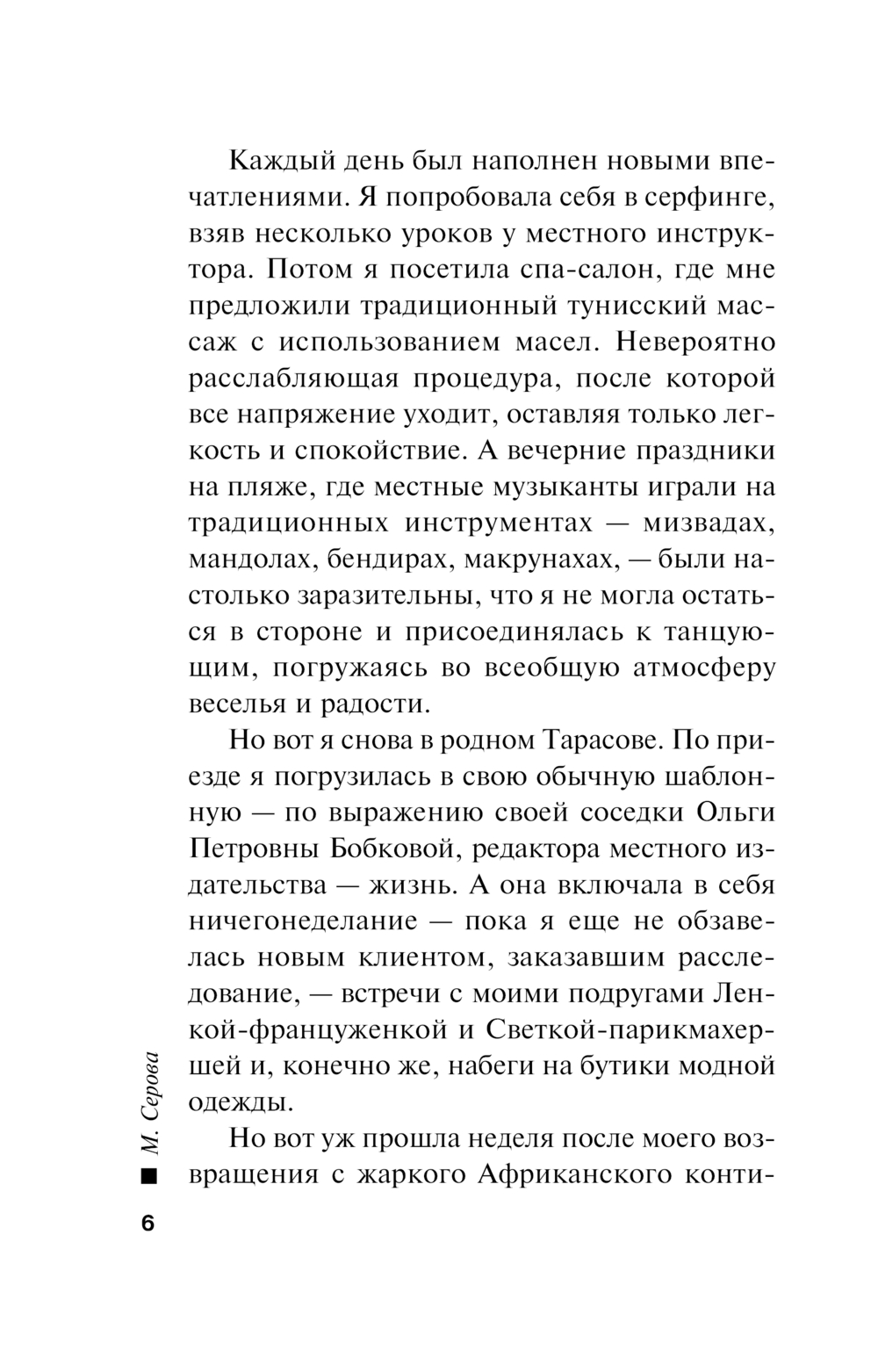 Частный детектив Татьяна Иванова даже не подозревала, что поиски Маргариты, дочери бизнесмена Подхомутникова, приведут ее сначала в жаркий Адлер на Черном море, а позже в – Тунис. При определении местонахождения беглянки Татьяна использовала все современные средства детективного искусства, но вокруг Маргариты стали погибать ее знакомые…