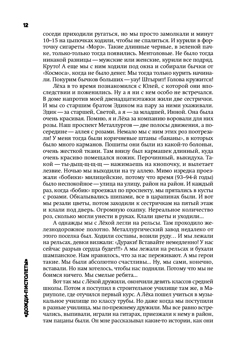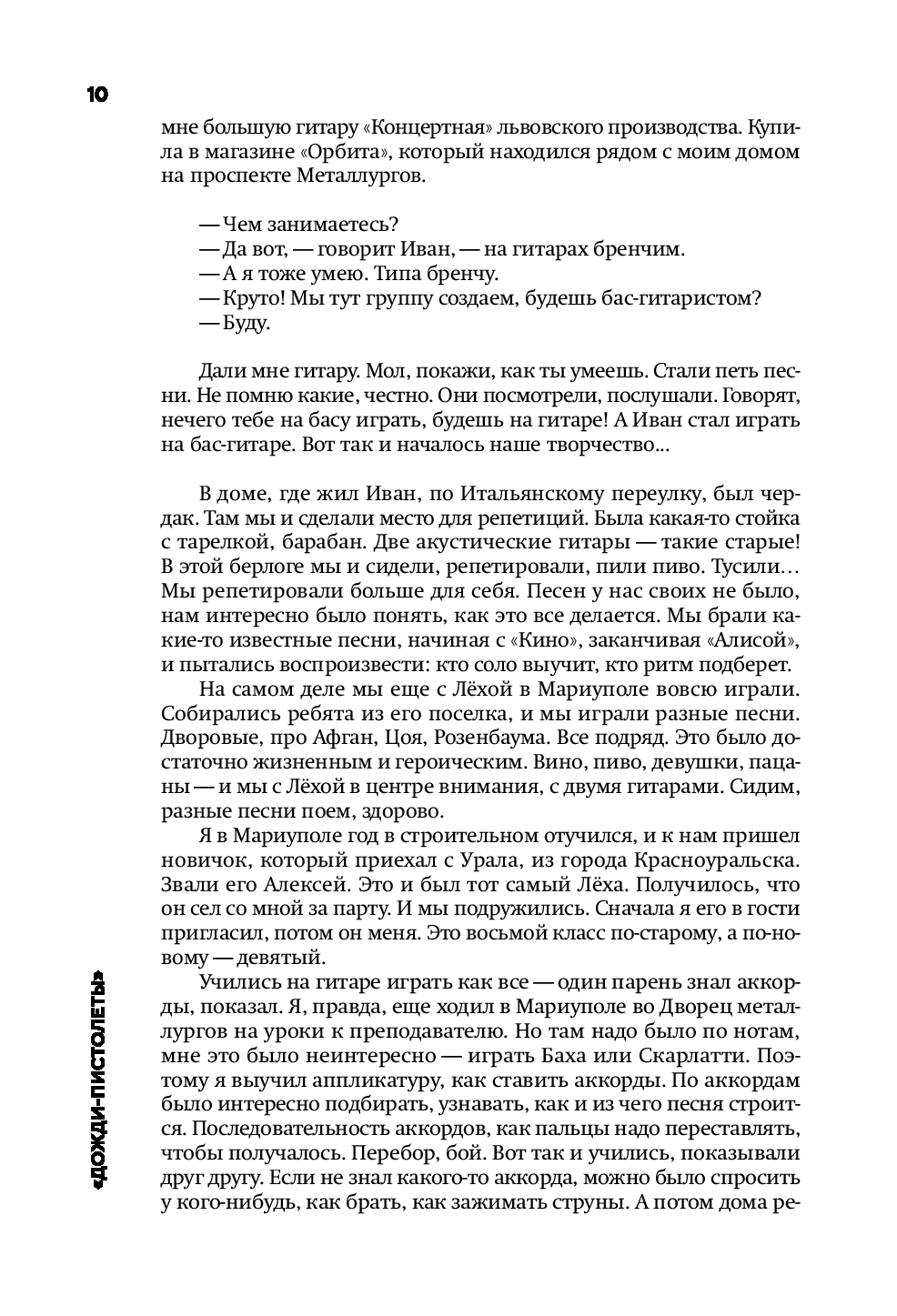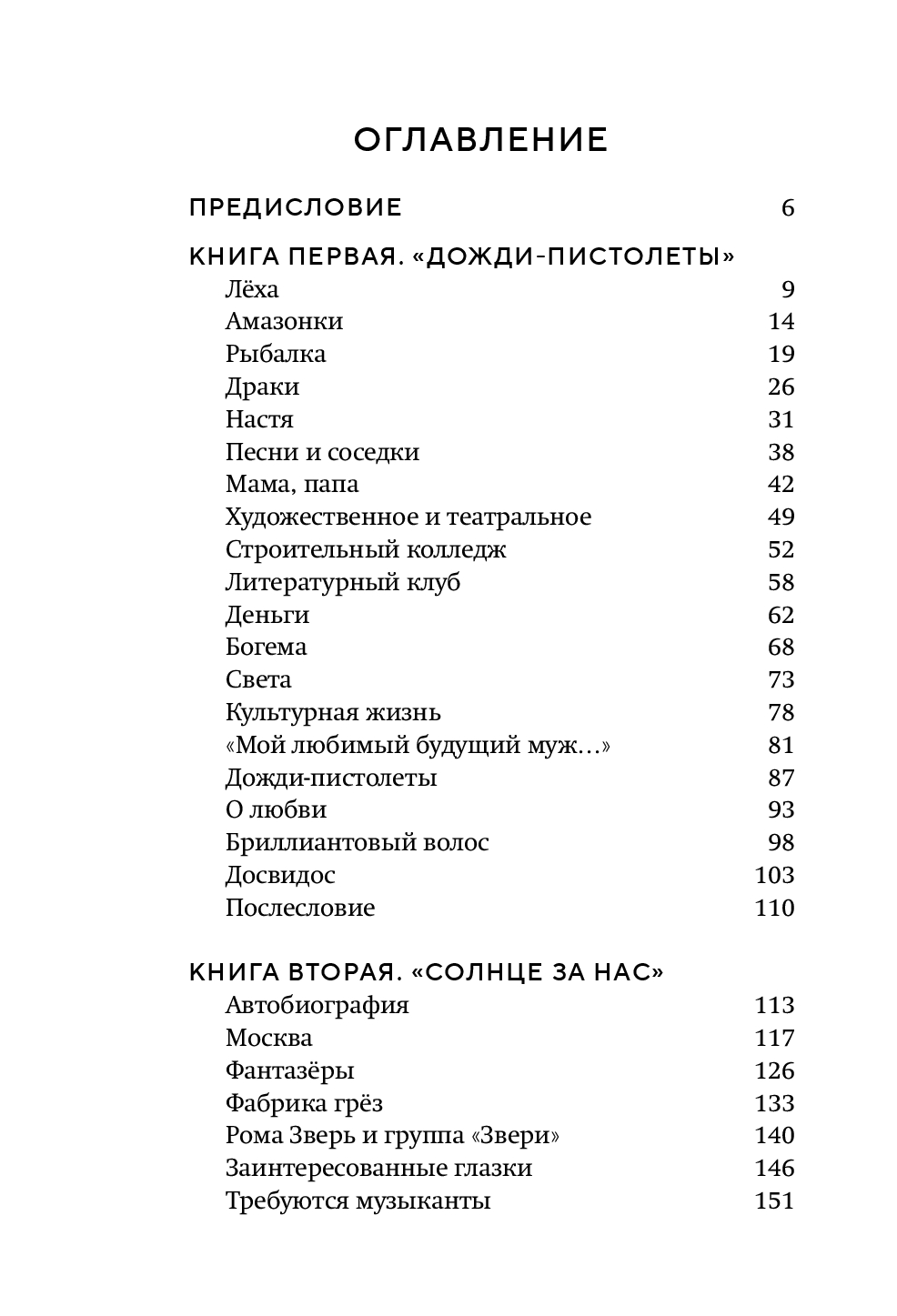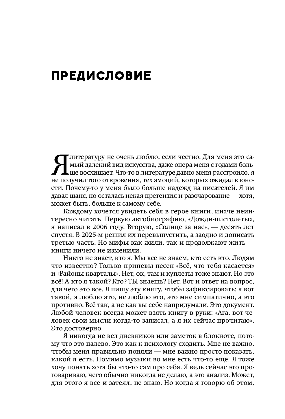 Книга охватывает двадцать пять лет жизни артиста и три ключевых эпохи: провинциального парня из Таганрога с мечтами размером со Вселенную (первая часть "Дожди-пистолеты"), хронику превращения неизвестной группы в культовую (вторая часть "Солнце за нас") и философские размышления зрелого артиста, который задает себе неожиданные вопросы (третья часть "С чистого листа").