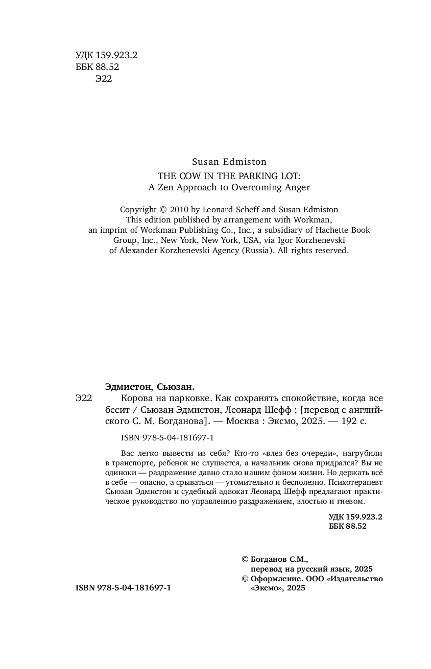 | Название в оригинале | THE COW IN THE PARKING LOT: A Zen Approach to Overcoming Anger by Susan Edmiston |