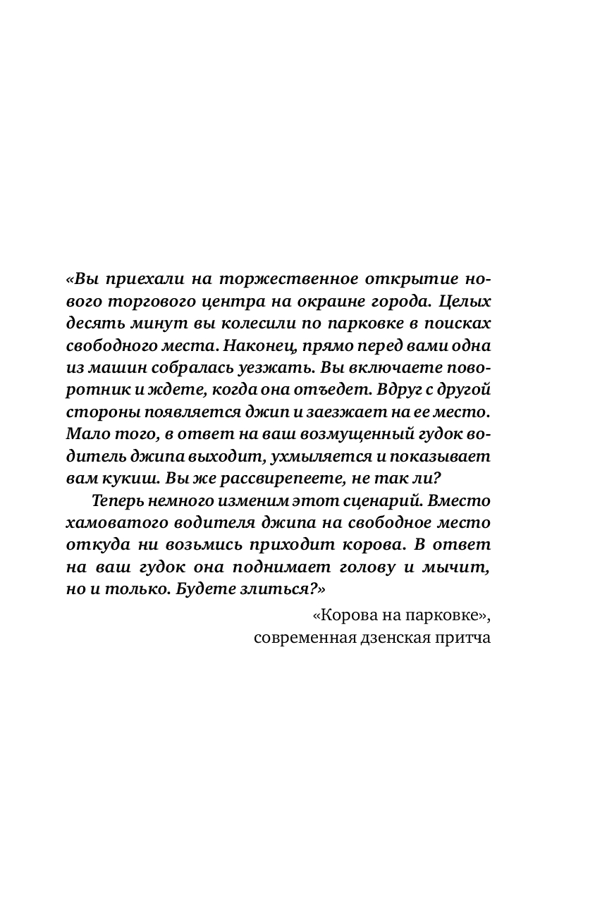 Вы спешите, ищете парковочное место, и вдруг корова – посреди дороги. Она мешает проехать, все вокруг сигналят и машут руками. Чем больше злитесь вы, тем спокойнее она. Бесит, правда? Но держать все в себе – опасно, а срываться – утомительно и бесполезно. Психотерапевт Сьюзан Эдмистон и судебный адвокат Леонард Шефф предлагают простой и эффективный способ борьбы с негативными эмоциями. Вместо изматывающих вспышек ярости вы научитесь сохранять спокойствие, даже если внутри все кипит.