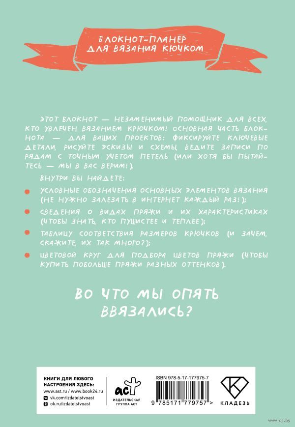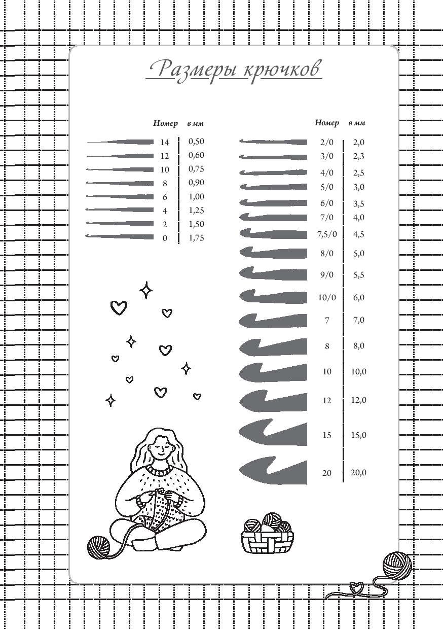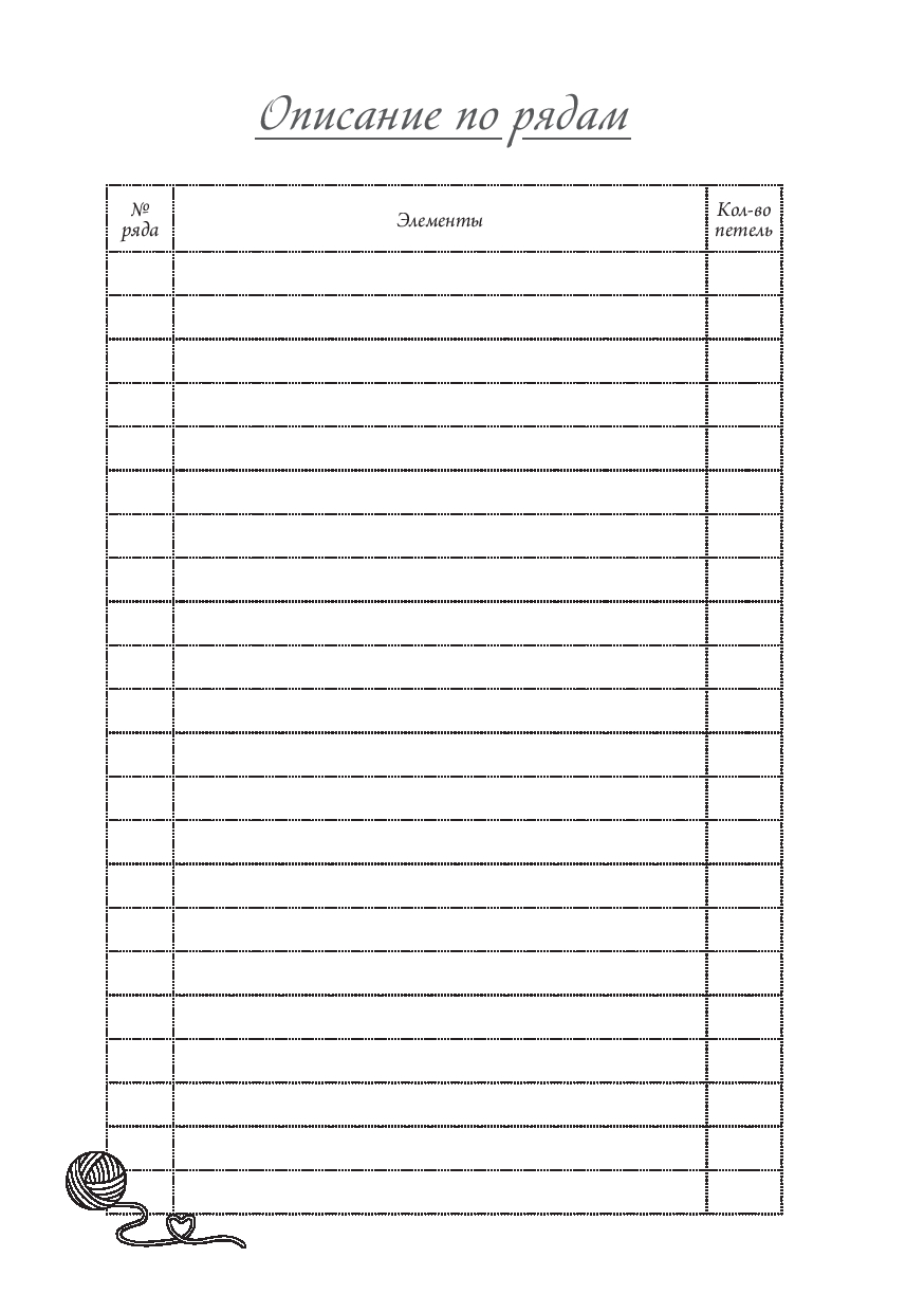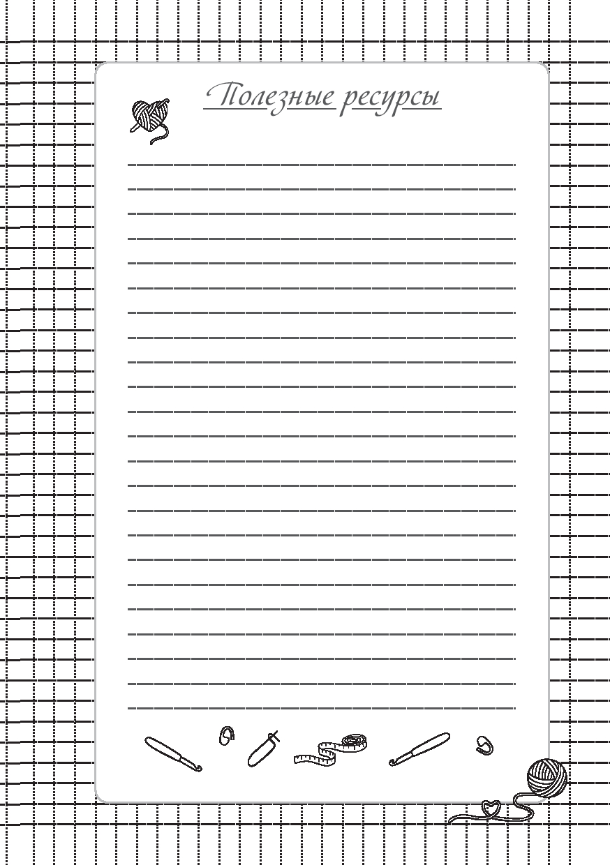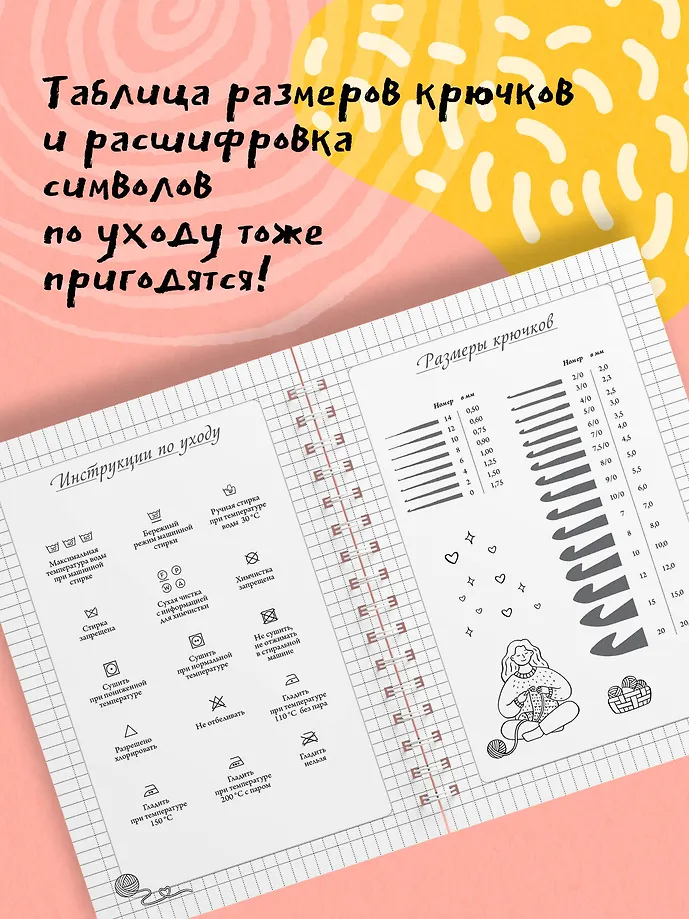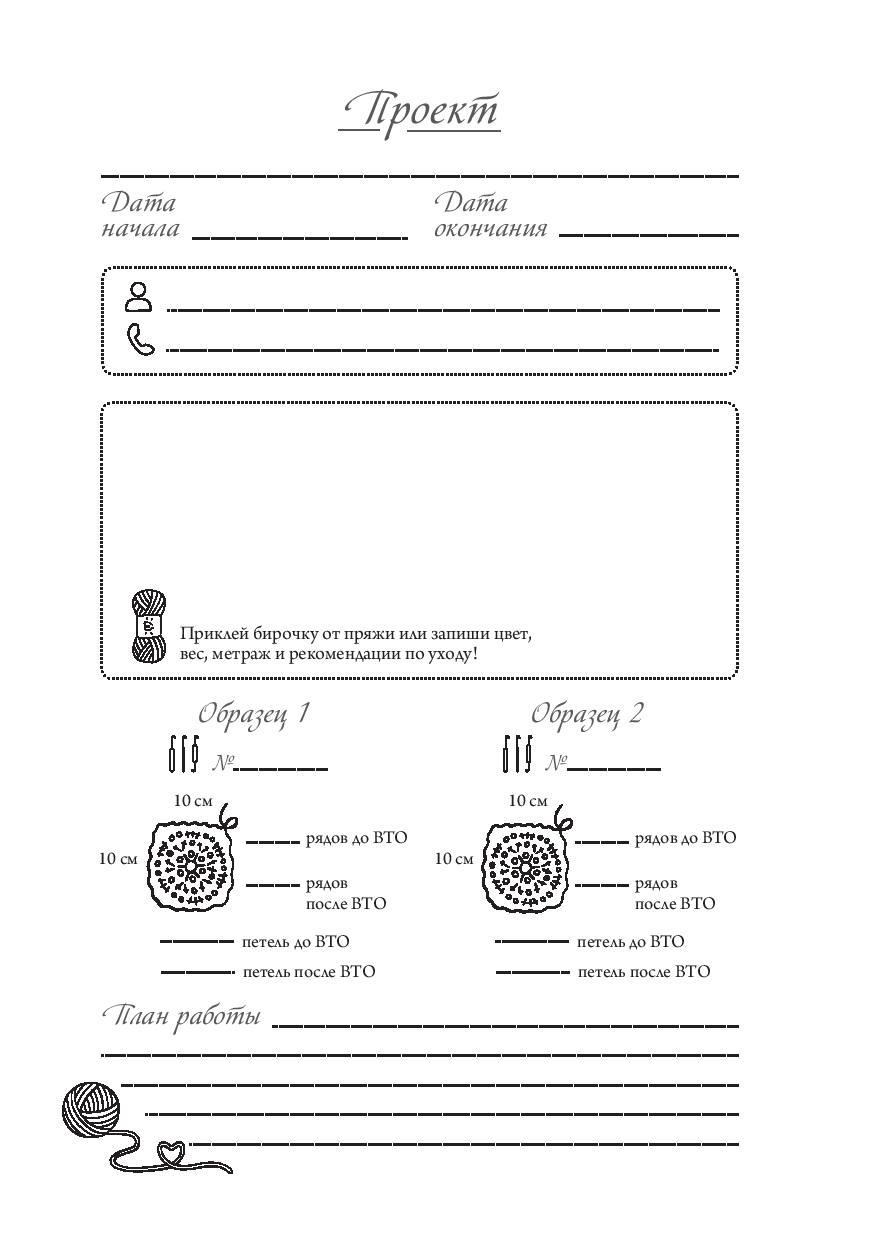 Этот блокнот – незаменимый помощник для всех, кто увлечен вязанием крючком. В нем собрана полезная информация: условные обозначения элементов, сведения о видах пряжи, расшифровка символов по уходу за изделиями, таблица размеров крючков – все необходимое будет всегда под рукой. Основная часть блокнота предназначена для записи проектов: здесь удобно фиксировать ключевые детали, рисовать эскизы и схемы, вести поэтапные записи по рядам с точным учетом количества петель. Этот блокнот поможет вам упорядочить идеи, сохранить вдохновение и сделать процесс вязания еще более организованным и приятным.