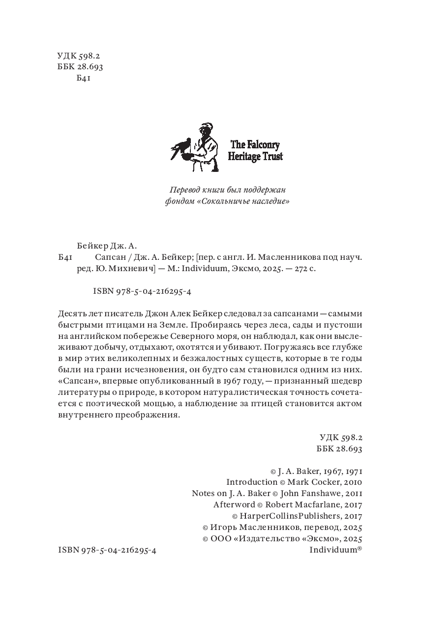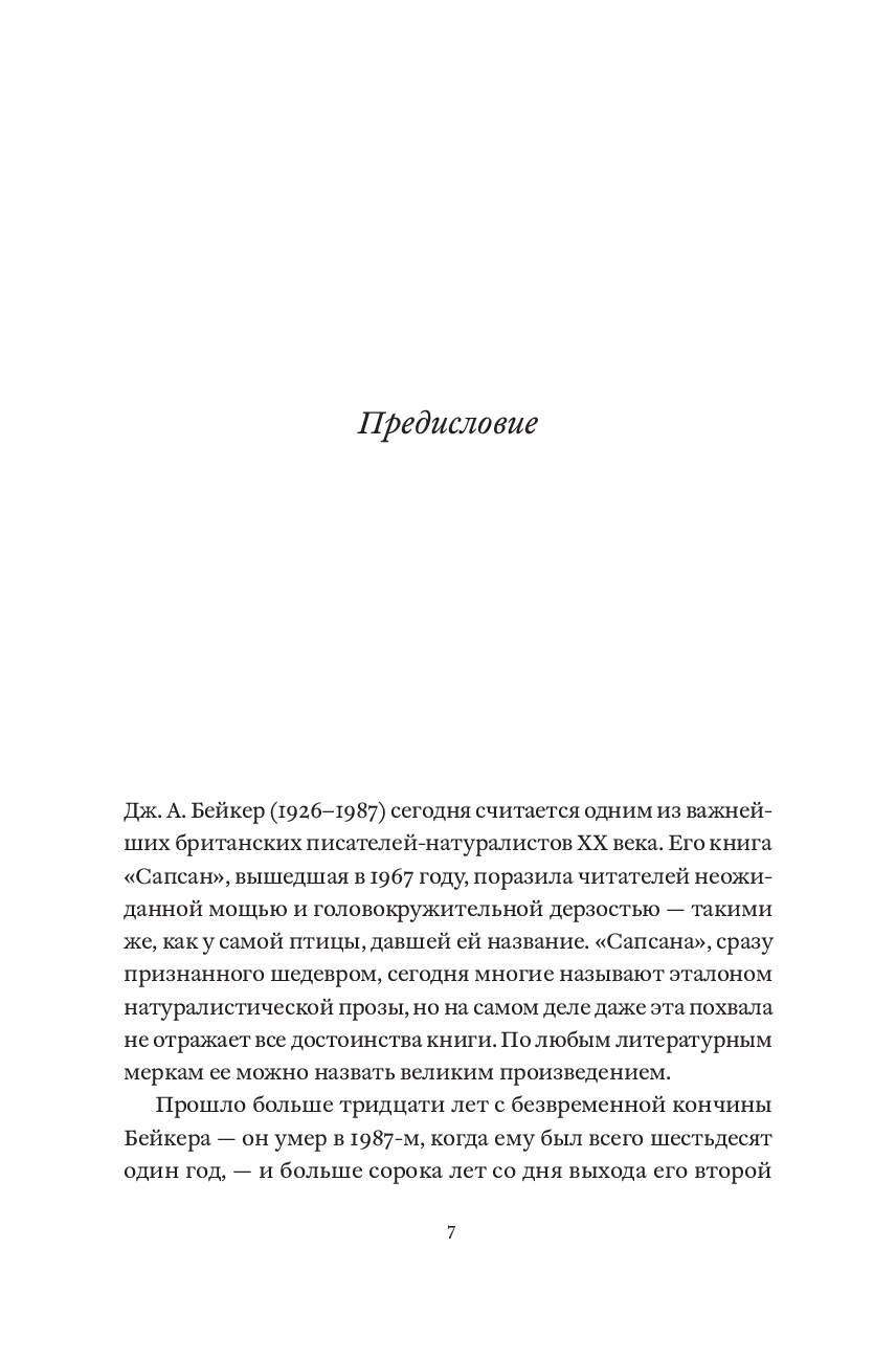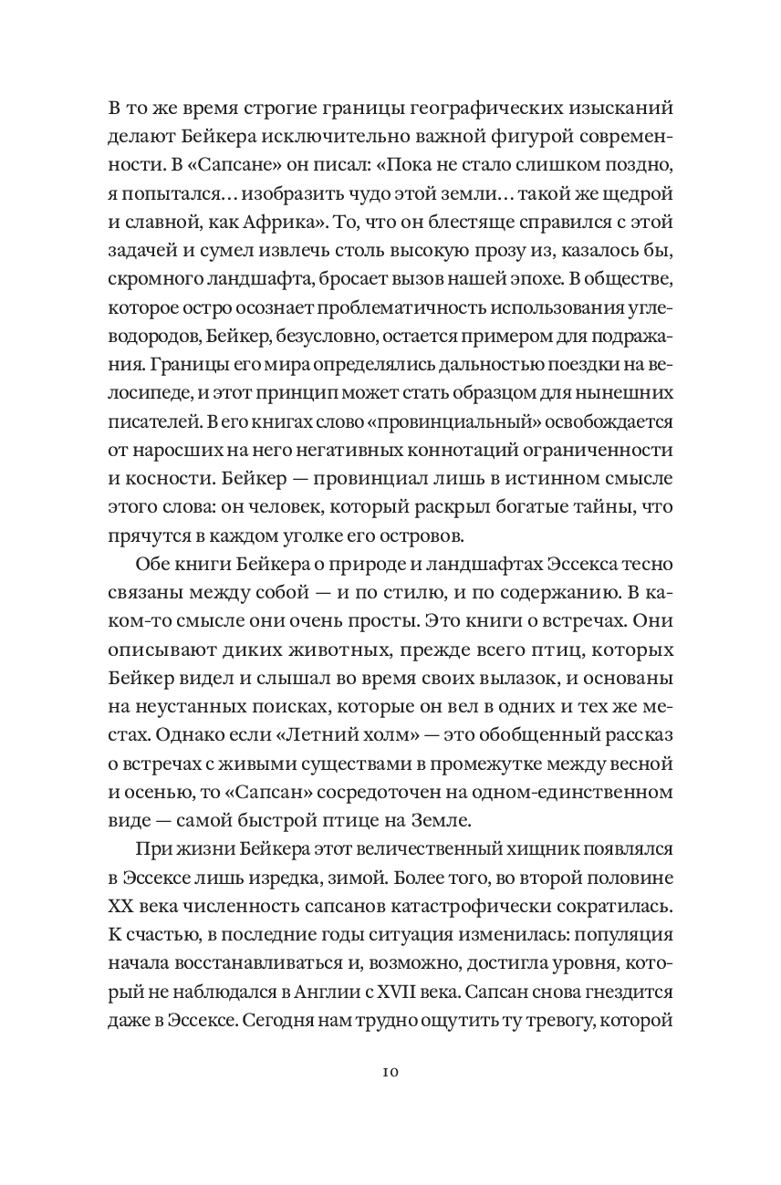 Десять лет писатель Джон Алек Бейкер следовал за сапсанами – самыми быстрыми птицами на Земле. Пробираясь через леса, сады и пустоши на английском побережье Северного моря, он наблюдал, как они выслеживают добычу, отдыхают, охотятся и убивают. Погружаясь все глубже в мир этих великолепных и безжалостных существ, которые в те годы были на грани исчезновения, он будто сам становился одним из них. "Сапсан", впервые опубликованный в 1967 году, – признанный шедевр литературы о природе, в котором натуралистическая точность сочетается с поэтической мощью, а наблюдение за птицей становится актом внутреннего преображения.