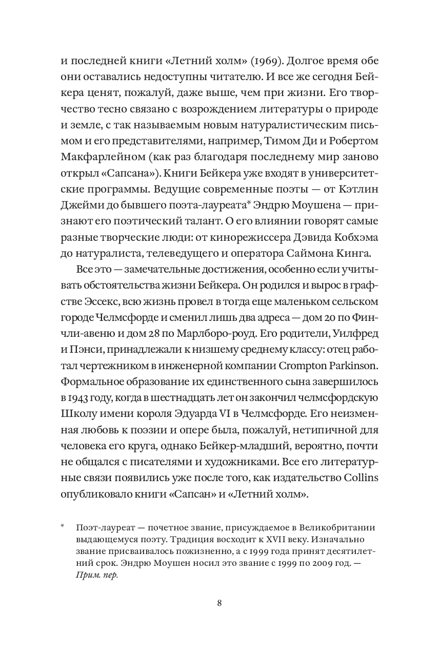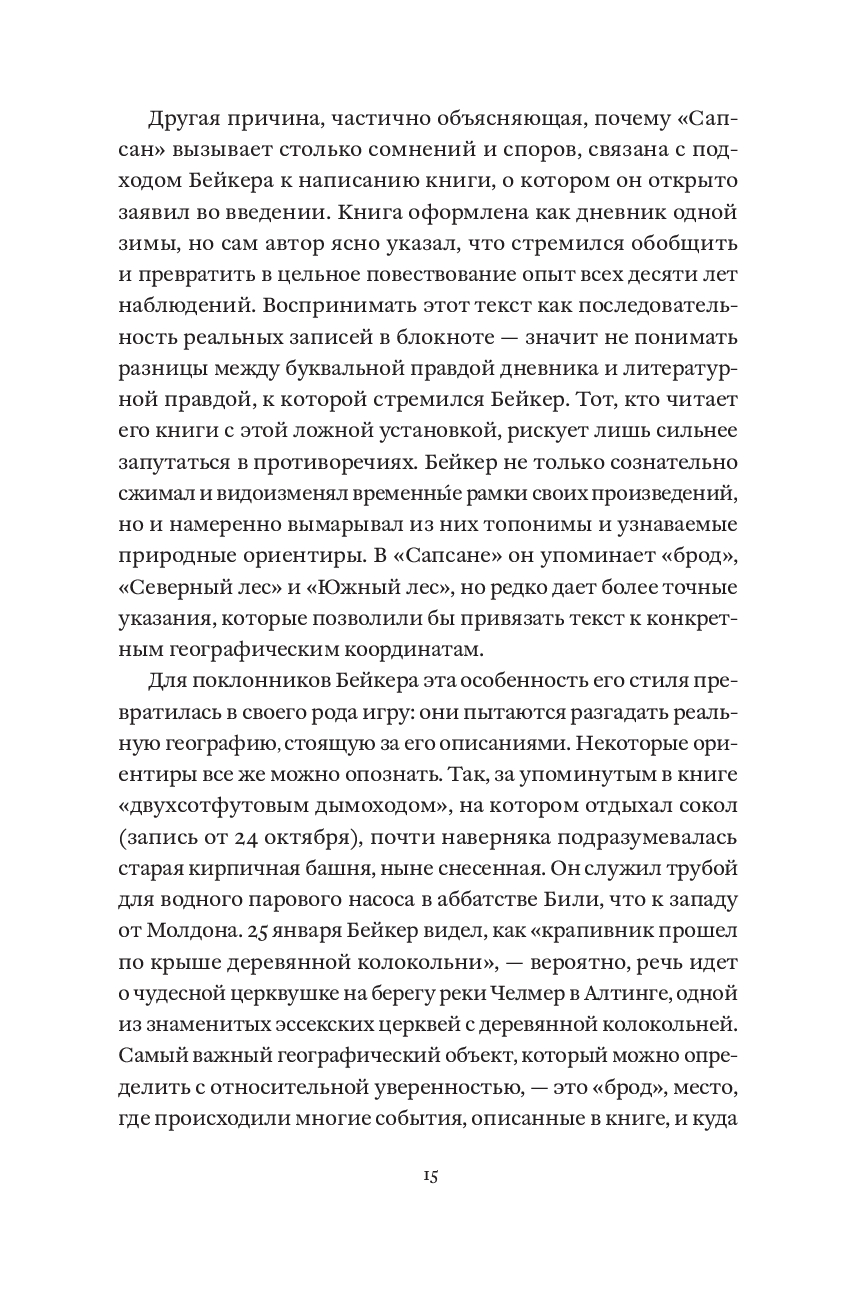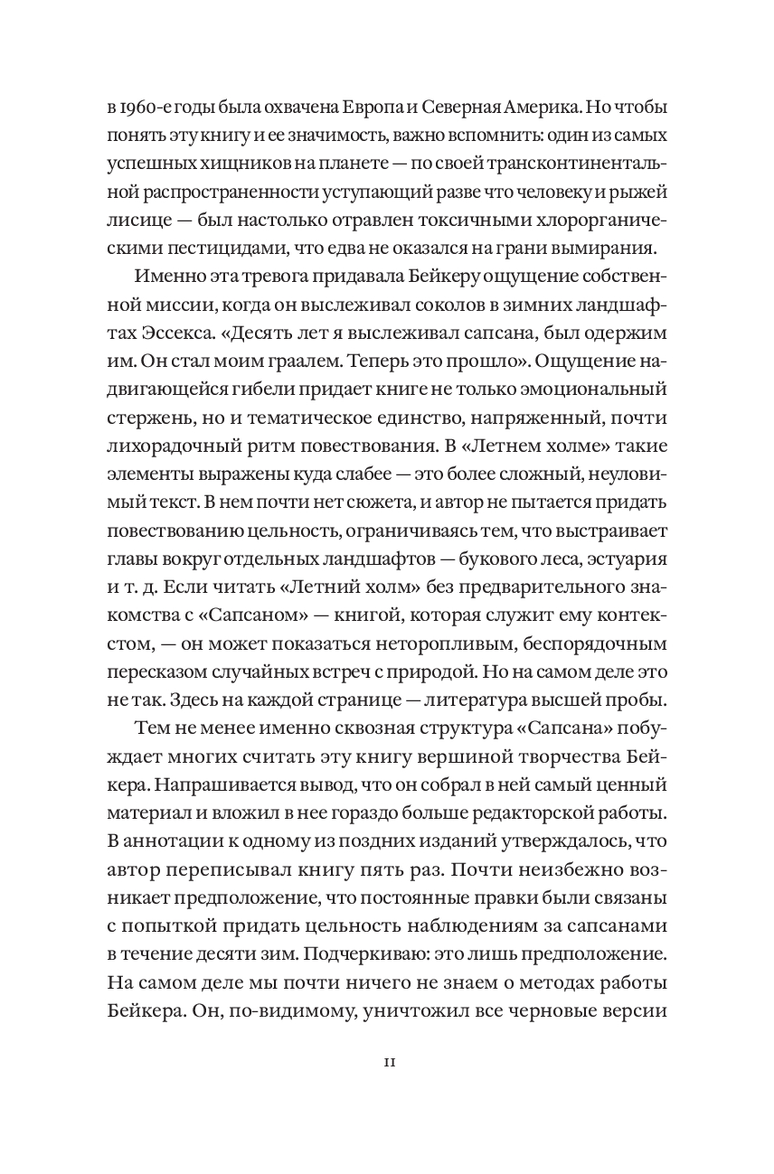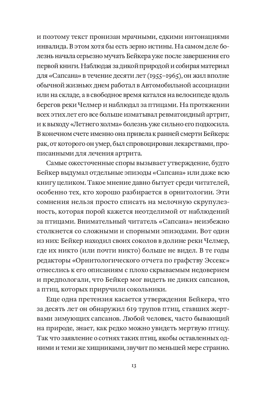 Десять лет писатель Джон Алек Бейкер следовал за сапсанами – самыми быстрыми птицами на Земле. Пробираясь через леса, сады и пустоши на английском побережье Северного моря, он наблюдал, как они выслеживают добычу, отдыхают, охотятся и убивают. Погружаясь все глубже в мир этих великолепных и безжалостных существ, которые в те годы были на грани исчезновения, он будто сам становился одним из них. "Сапсан", впервые опубликованный в 1967 году, – признанный шедевр литературы о природе, в котором натуралистическая точность сочетается с поэтической мощью, а наблюдение за птицей становится актом внутреннего преображения.