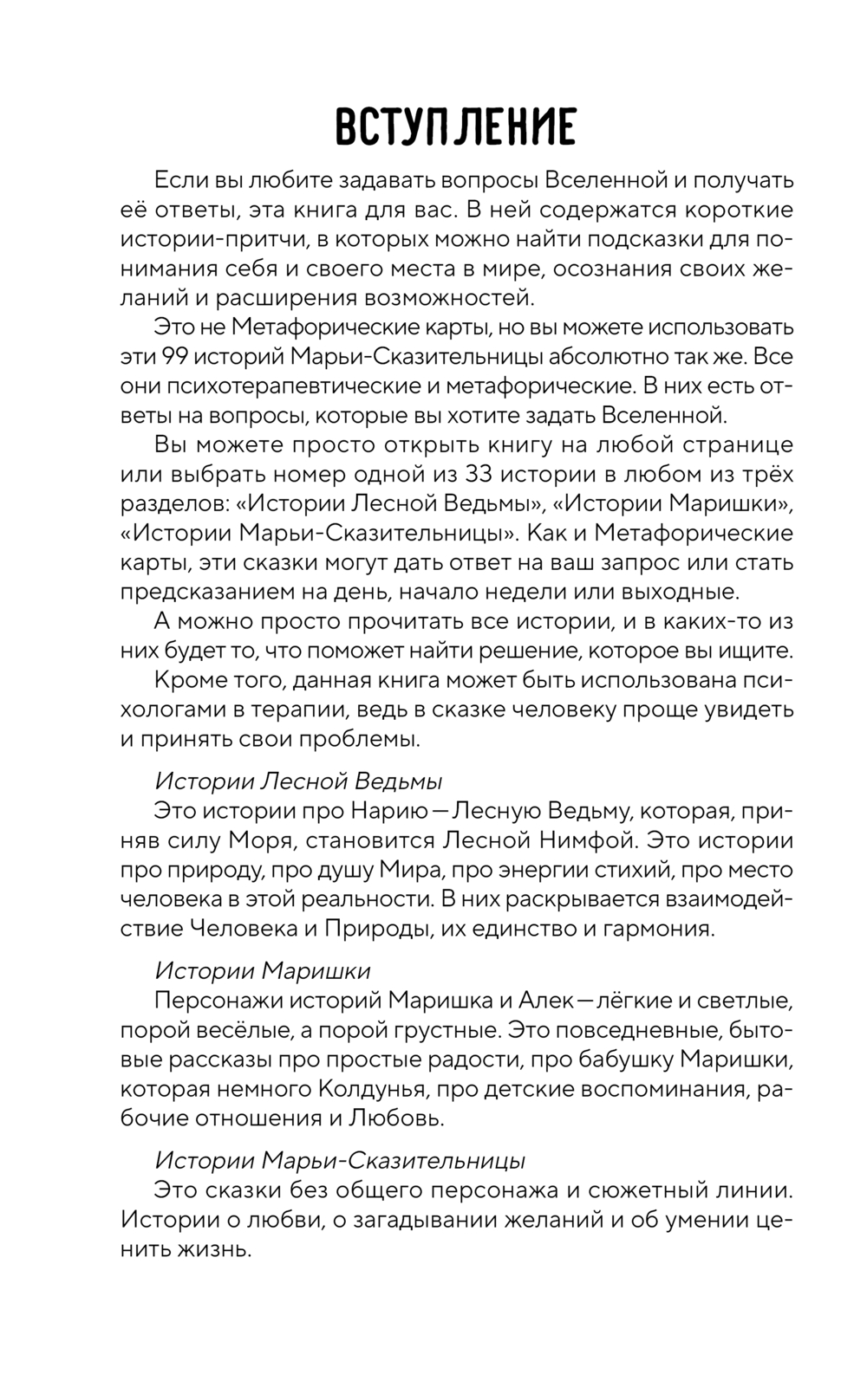 Это не метафорические карты, но вы можете использовать все эти 99 историй Марьи Сказительницы абсолютно так же. Можно просто открыть книгу на любой странице и история, которая выпала вам, будет содержать ответ на ваш запрос или стать предсказанием на день, начало недели или выходные.