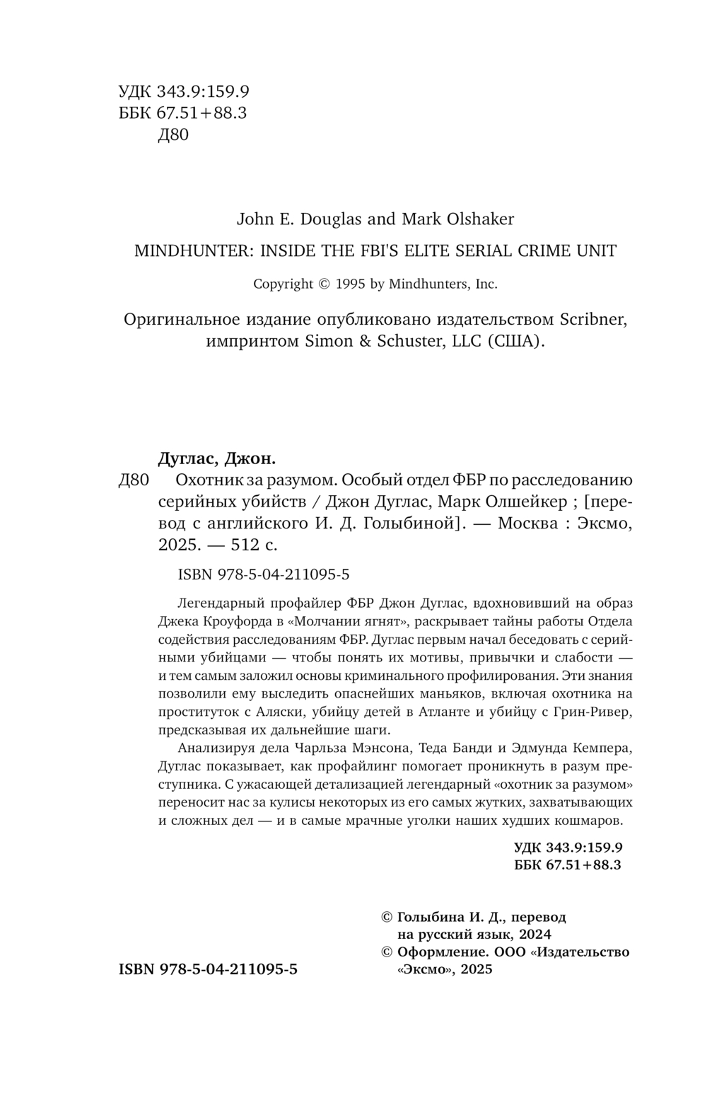 Анализируя дела Чарльза Мэнсона, Теда Банди и Эдмунда Кемпера, Дуглас показывает, как профайлинг помогает проникнуть в разум преступника. С ужасающей детализацией легендарный "охотник за разумом" переносит нас за кулисы некоторых из его самых жутких, захватывающих и сложных дел – и в самые мрачные уголки наших худших кошмаров.