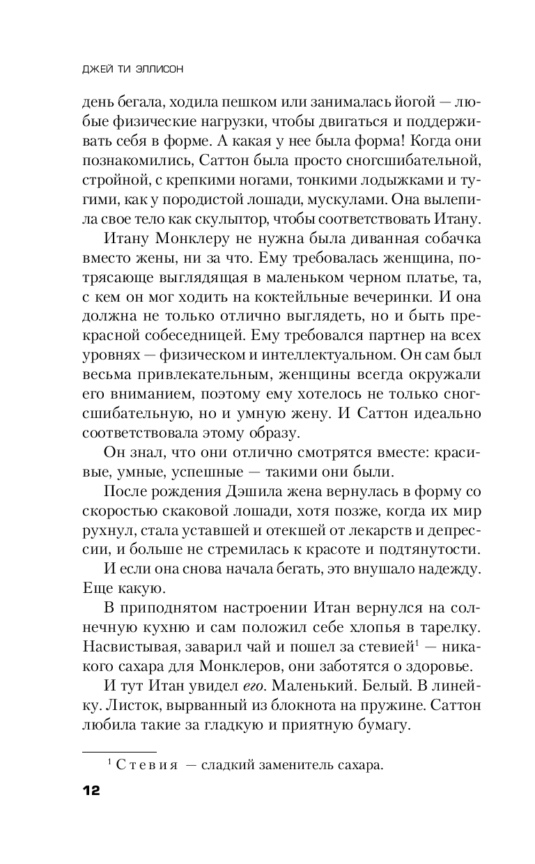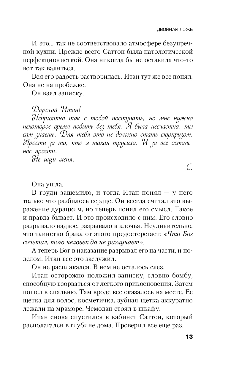 Однажды Саттон исчезает, оставляя мужу записку: "Не ищи меня". Но разве можно этому повиноваться? Подруги напуганы и как будто уже в чем-то подозревают Итана: они знали, что он завидовал литературным успехам жены, видели синяки на теле Саттон. Да и день исчезновения подозрительный – годовщина смерти их ребенка.
