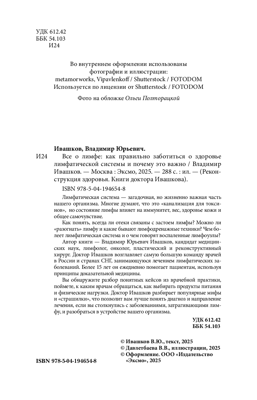 Автор книги – Владимир Юрьевич Ивашков, кандидат медицинских наук, лимфолог, онколог, пластический и реконструктивный хирург. Доктор Ивашков возглавляет самую большую команду врачей в России и странах СНГ, занимающуюся лечением лимфатических заболеваний. Более 15 лет он ежедневно помогает пациентам, используя принципы доказательной медицины.