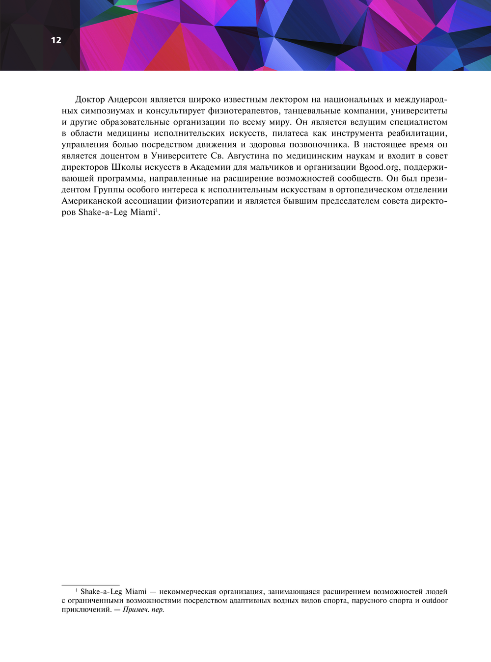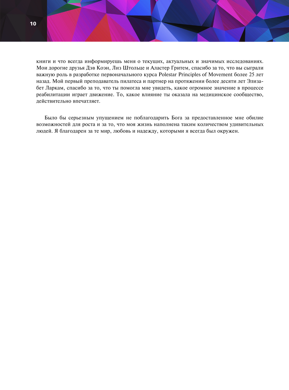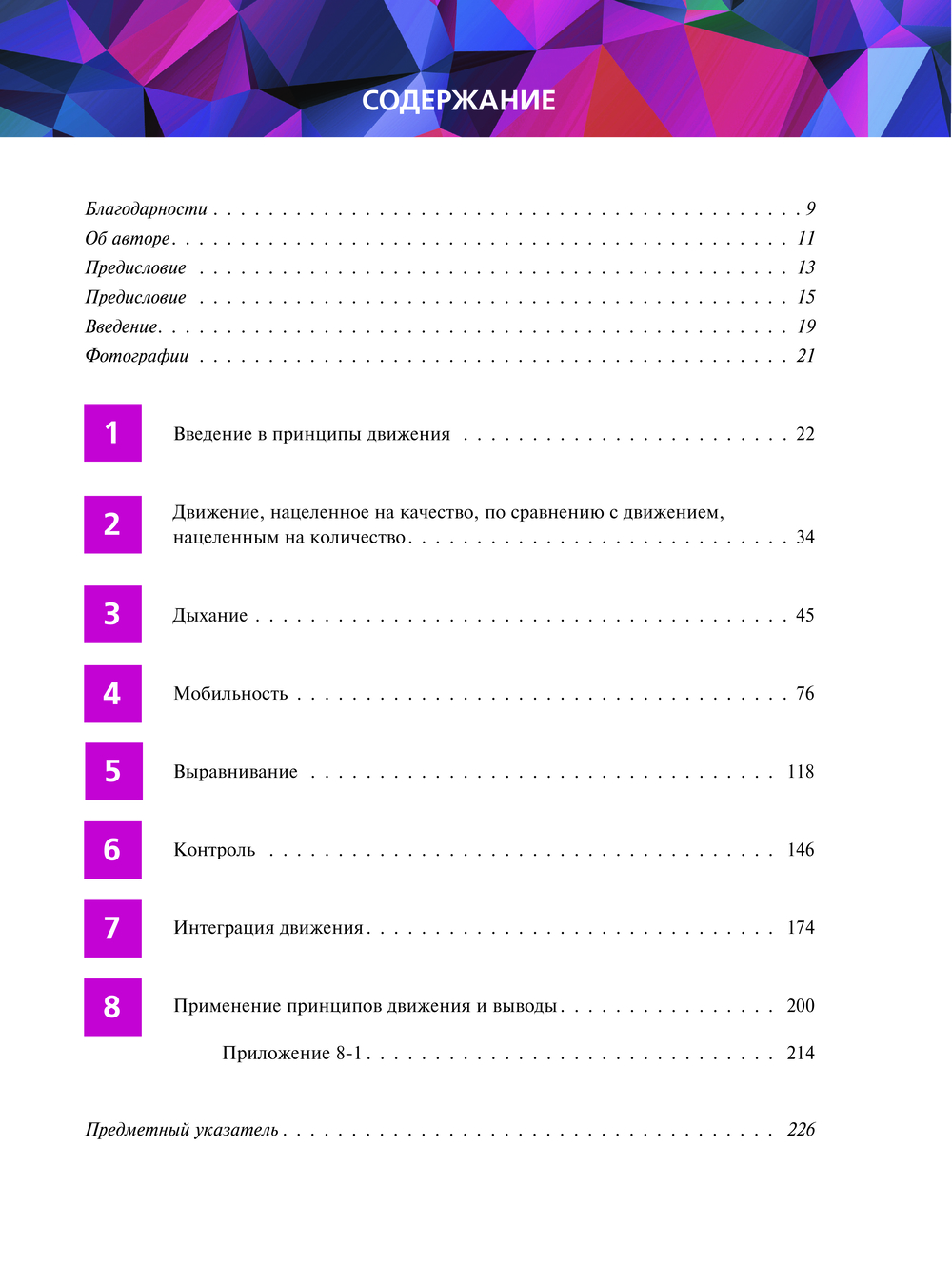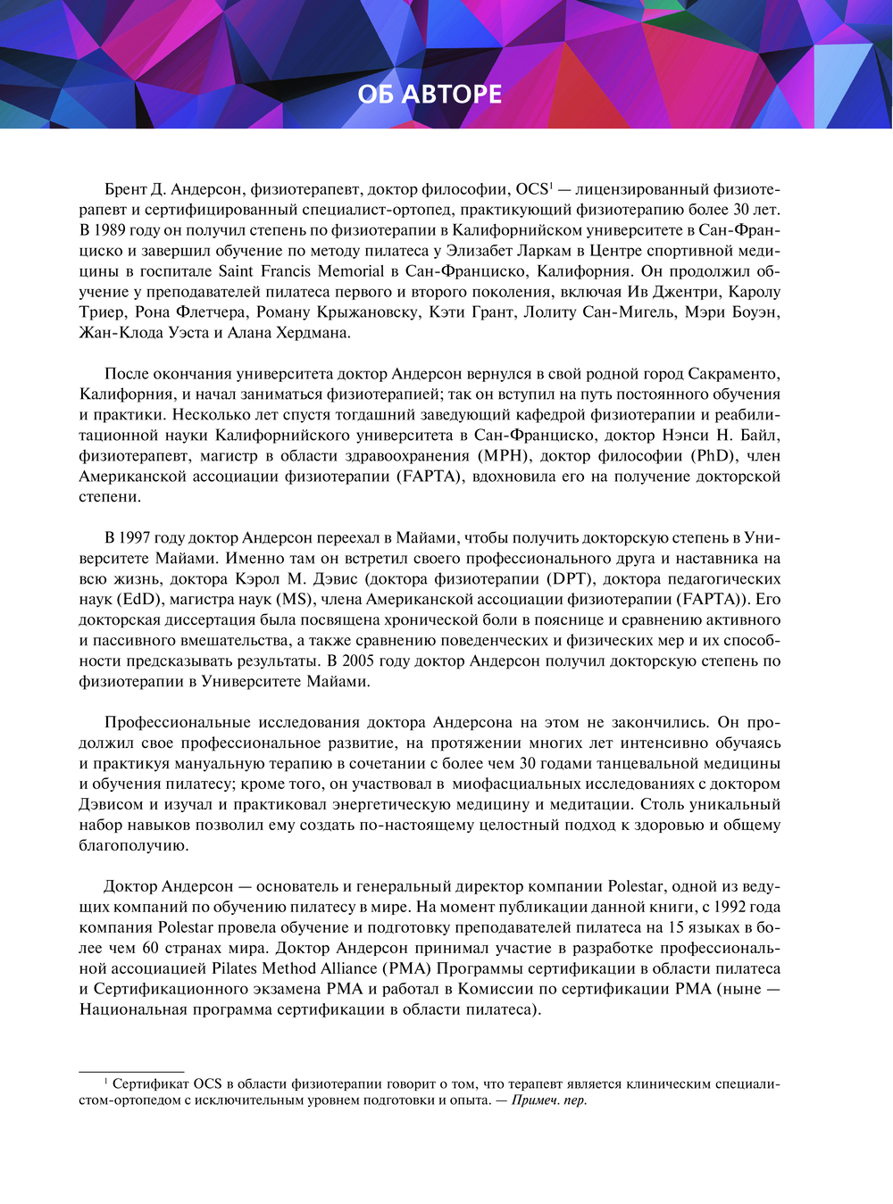 Книга "Принципы движения", написанная основателем методики Polestar Pilates Брентом Андерсеном, представляет собой практическое руководство по биомеханике для специалистов, практикующих пилатес, мануальных и двигательных терапевтов и спортивных врачей. А также для всех тех, кто ищет практичный и простой способ улучшить свои двигательные навыки на сцене и в жизни. Программа, описанная в книге, применяется в физиотерапии, трудотерапии, в процессе спортивных тренировок, кинезиологии, физическом воспитании, пилатесе, йоге, танцах и т.д. Она предназначена для того, чтобы помочь практикующим специалистам повысить качество своей работы за счет лучшего понимания интегрированной модели оценки движений и облегчения боли в теле путем формирования неправильных паттернов движения.
