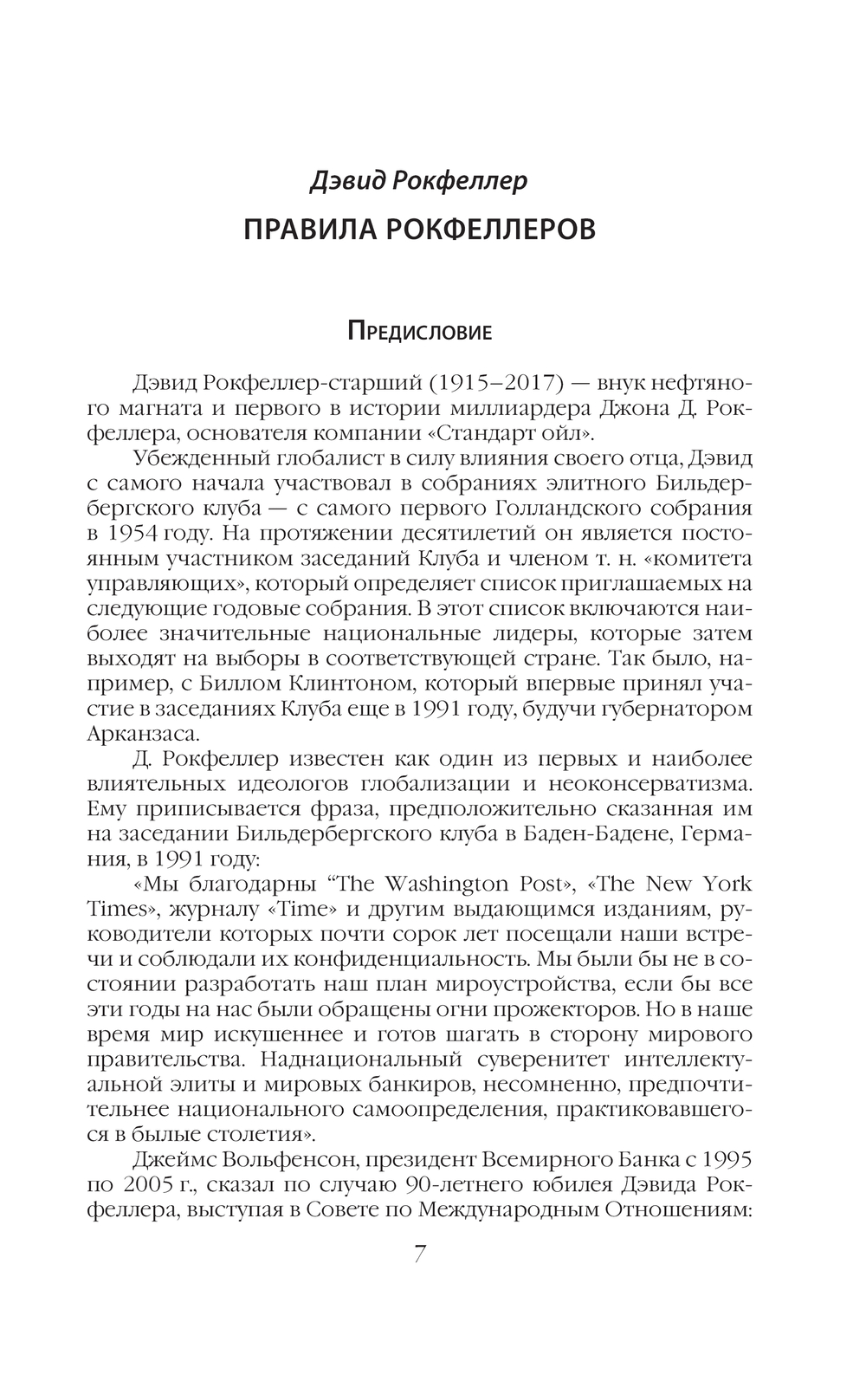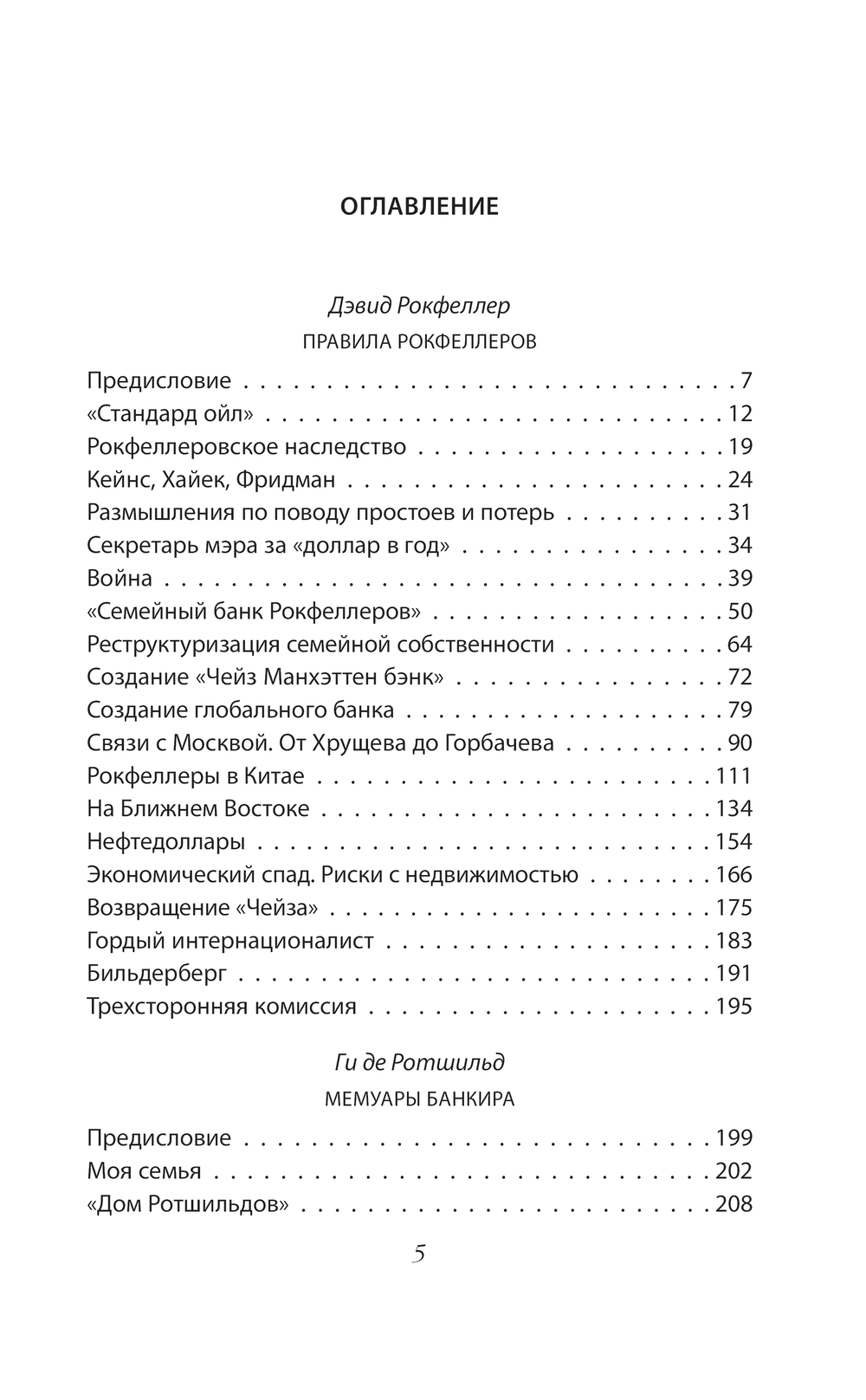 Сами они неохотно делятся своими секретами, тем не менее, иногда пускаются в откровения, из которых можно понять, где именно и какими методами ведется борьба за власть над миром. В данной книге представлены воспоминания Дэвида Рокфеллера, главы дома Рокфеллеров в 2004–2017 годах, государственного деятеля и глобалиста – и Ги де Ротшильда, председателя Совета директоров банка de Rothschild Frères.