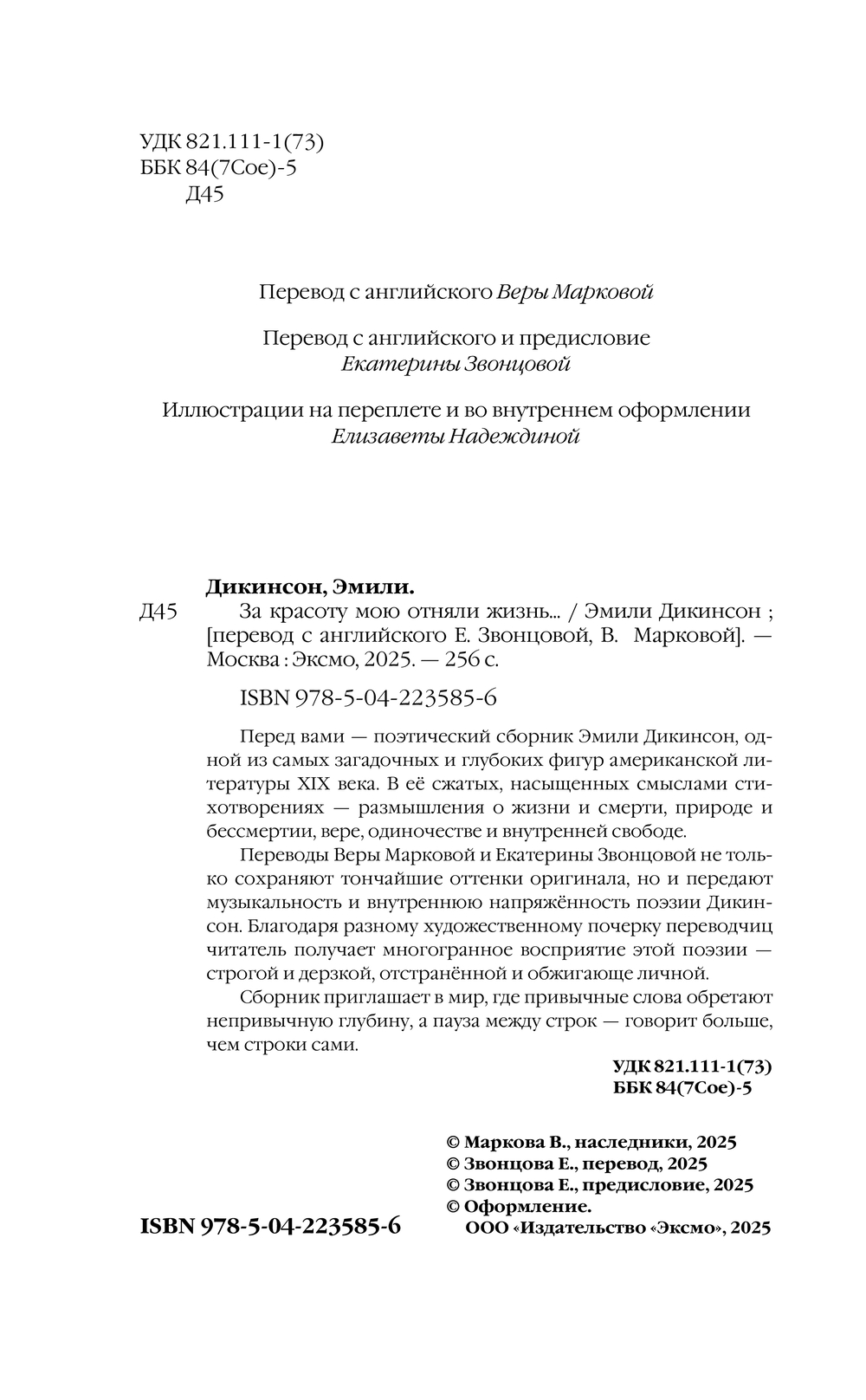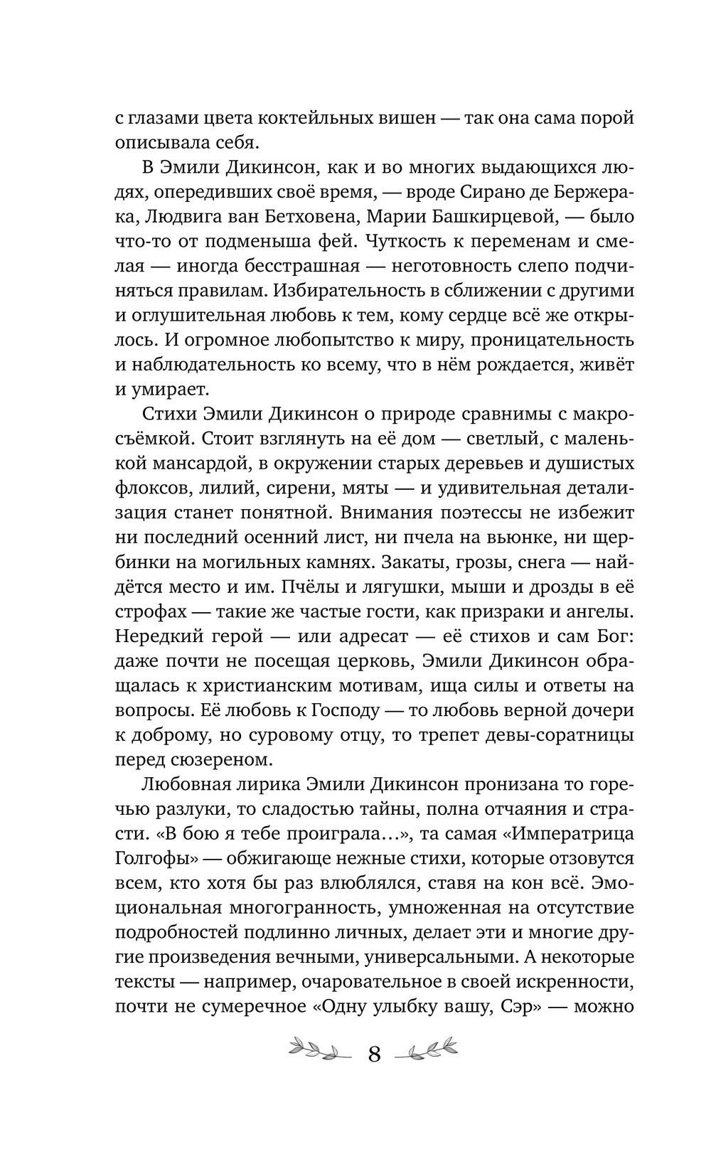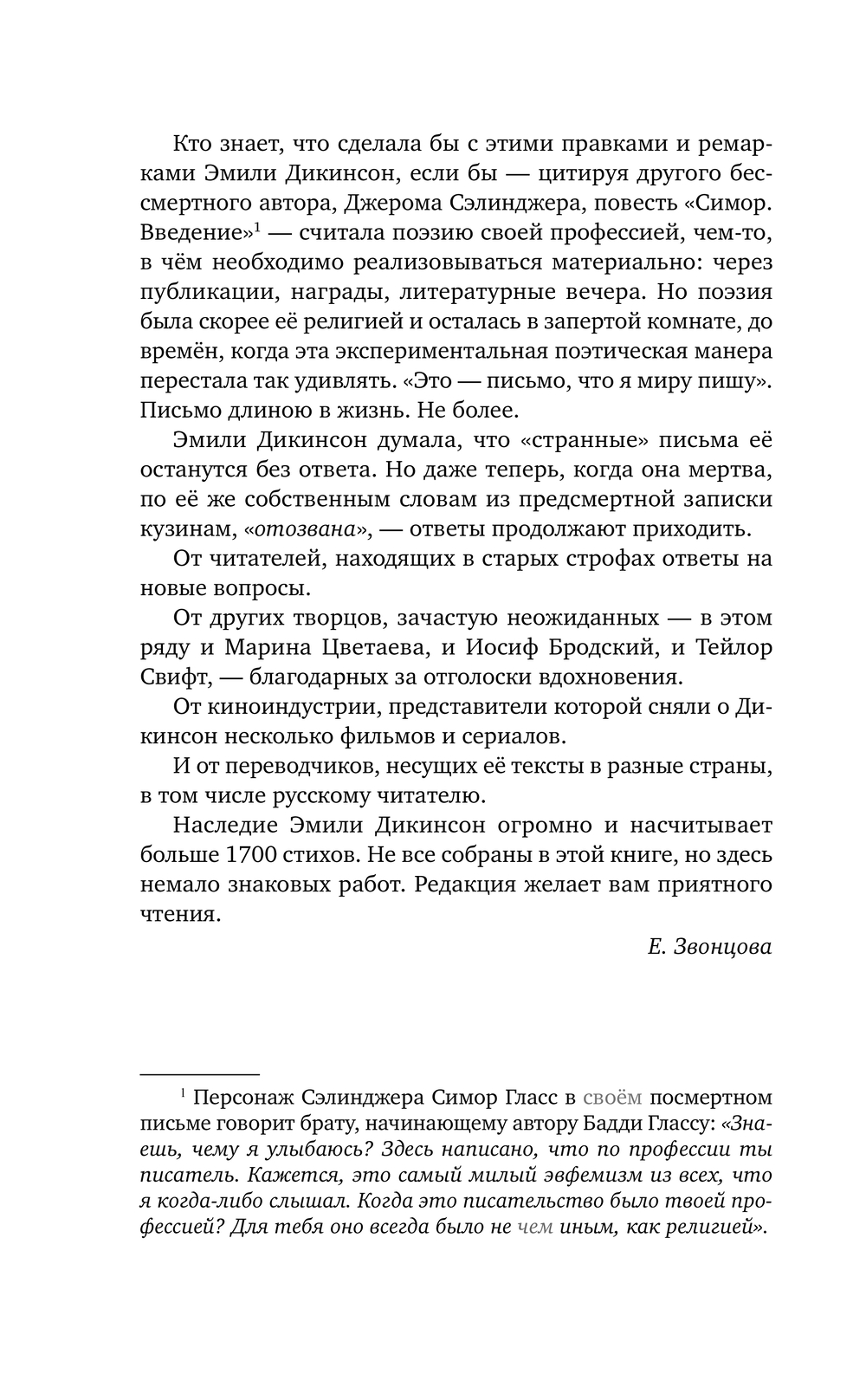 Переводы Веры Марковой и Екатерины Звонцовой не только сохраняют тончайшие оттенки оригинала, но и передают музыкальность и внутреннюю напряжённость поэзии Дикинсон. Благодаря разному художественному почерку переводчиц, читатель получает многогранное восприятие этой поэзии – строгой и дерзкой, отстранённой и обжигающе личной.