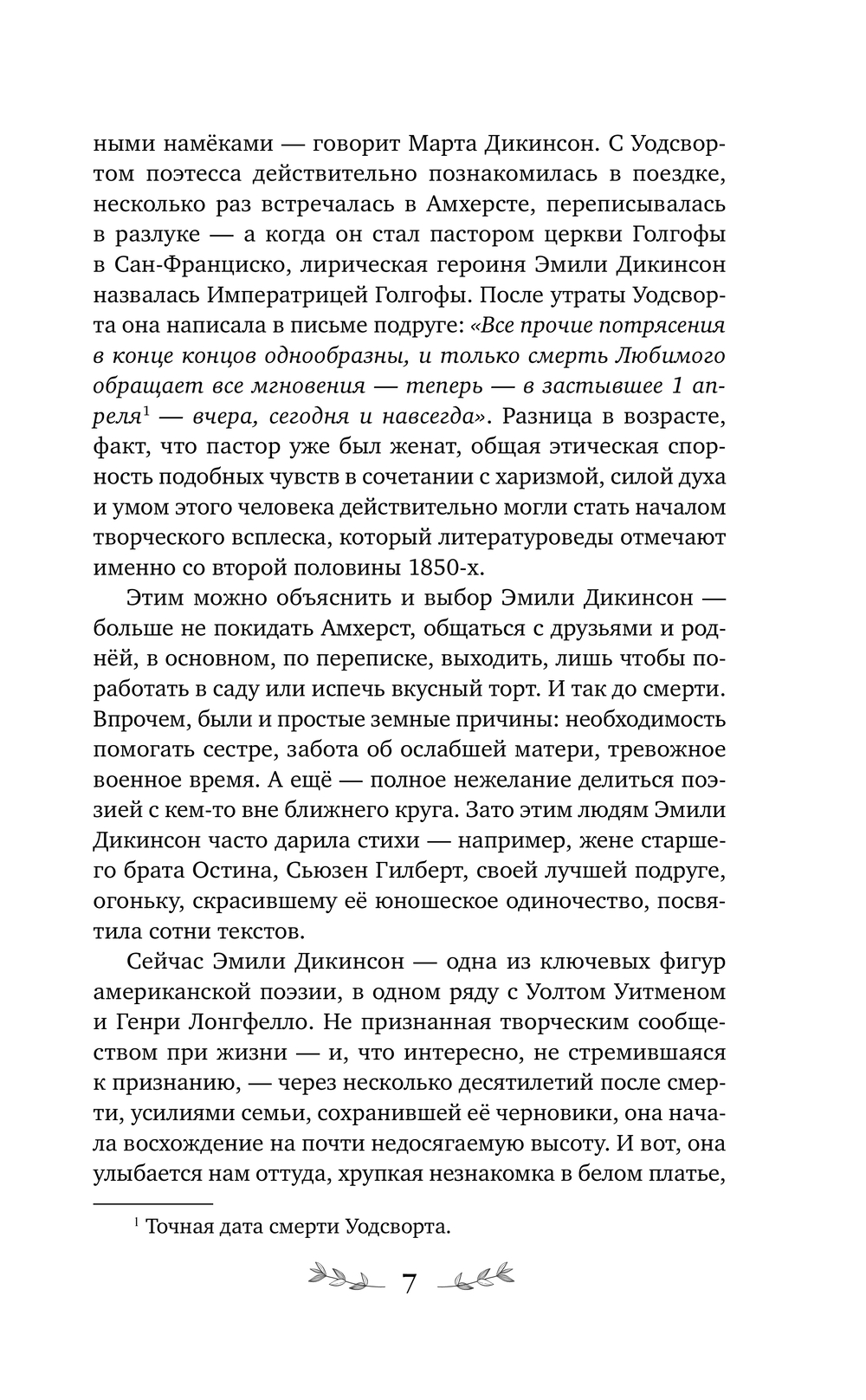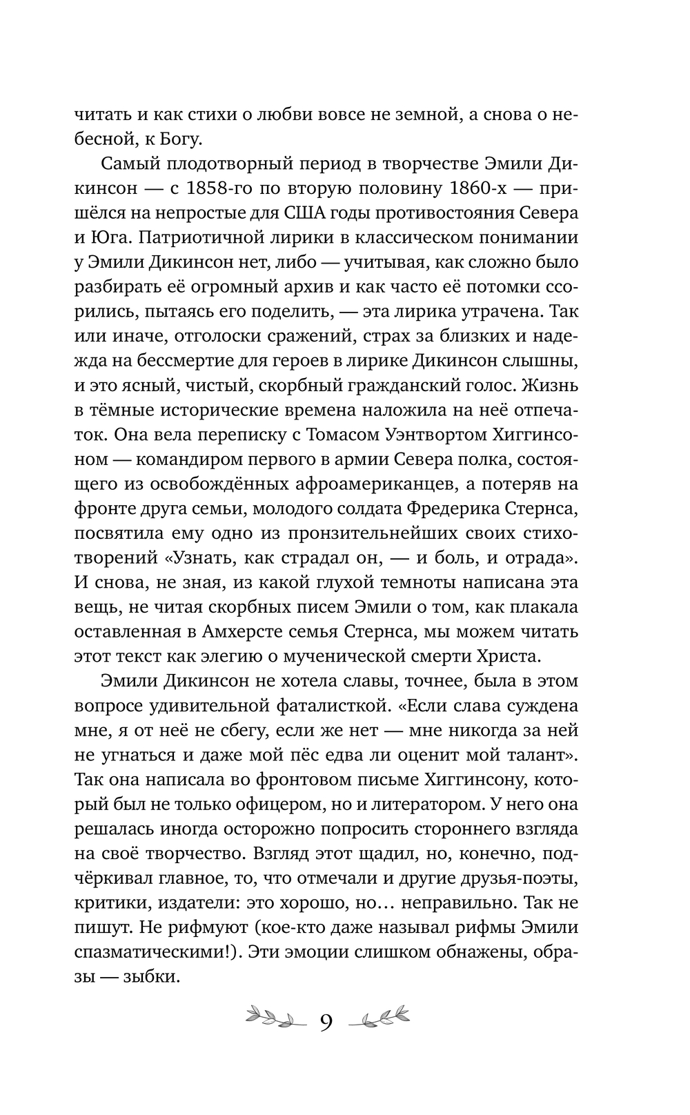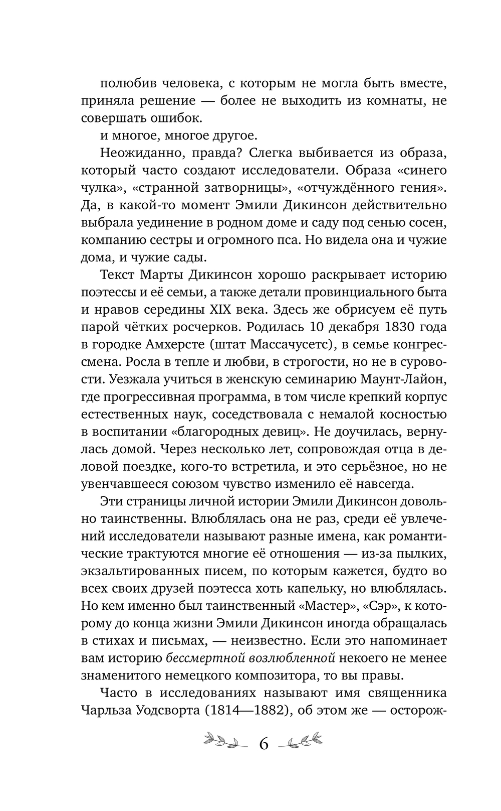 Переводы Веры Марковой и Екатерины Звонцовой не только сохраняют тончайшие оттенки оригинала, но и передают музыкальность и внутреннюю напряжённость поэзии Дикинсон. Благодаря разному художественному почерку переводчиц, читатель получает многогранное восприятие этой поэзии – строгой и дерзкой, отстранённой и обжигающе личной.