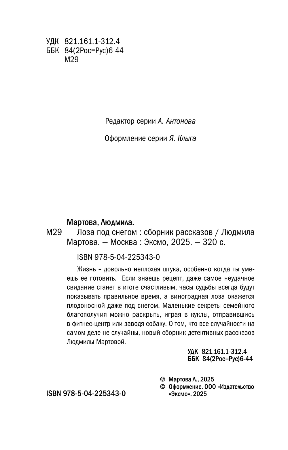 Жизнь – довольно неплохая штука, особенно когда ты умеешь ее готовить. Если знаешь рецепт, даже самое неудачное свидание станет в итоге счастливым, часы судьбы всегда будут показывать правильное время, а виноградная лоза окажется плодоносной даже под снегом. Маленькие секреты семейного благополучия можно раскрыть, играя в куклы, отправившись в фитнес-центр или заводя собаку. О том, что все случайности на самом деле не случайны, новый сборник детективных рассказов Людмилы Мартовой.