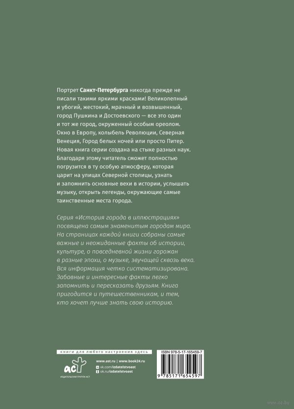 Портрет Санкт-Петербурга никогда прежде не писали такими яркими красками! Великолепный и убогий, жестокий, мрачный и возвышенный, город Пушкина и Достоевского – все это один и тот же город, окруженный особым ореолом. Окно в Европу, колыбель Революции, Северная Венеция, Город белых ночей или просто Питер. Новая книга серии создана на стыке разных наук. Благодаря этому читатель сможет полностью погрузится в ту особую атмосферу, которая царит на улицах Северной столицы, узнать и запомнить основные вехи в истории, услышать музыку, открыть легенды, окружающие самые таинственные места города.