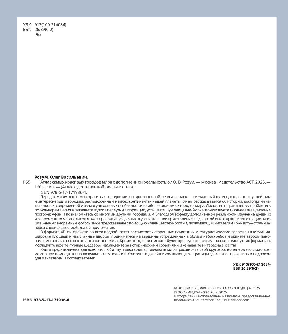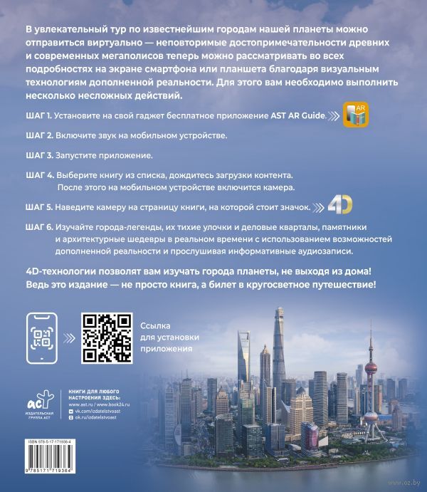 Книга предназначена для всех, кто любит путешествовать, познавать мир и расширять свой кругозор, но теперь это стало возможно при помощи новых визуальных технологий! Красочный дизайн и "оживающие" страницы сделают ее прекрасным подарком для мечтателей и исследователей!