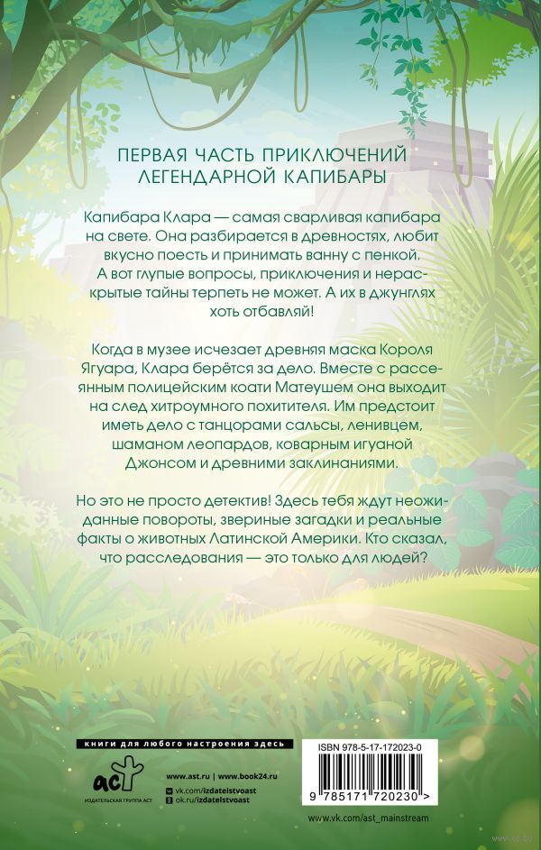 Капибара Клара – самая сварливая капибара на свете. Она разбирается в древностях, любит вкусно поесть и принимать ванну с пенкой. А вот глупые вопросы, приключения и нераскрытые тайны терпеть не может. А их в джунглях хоть отбавляй!