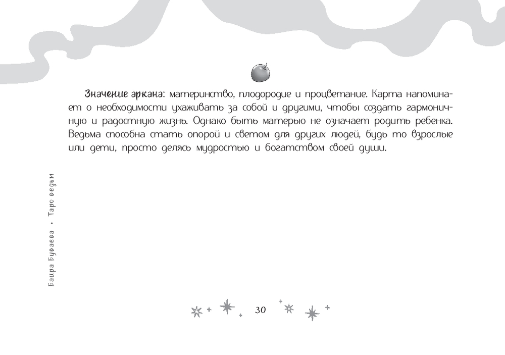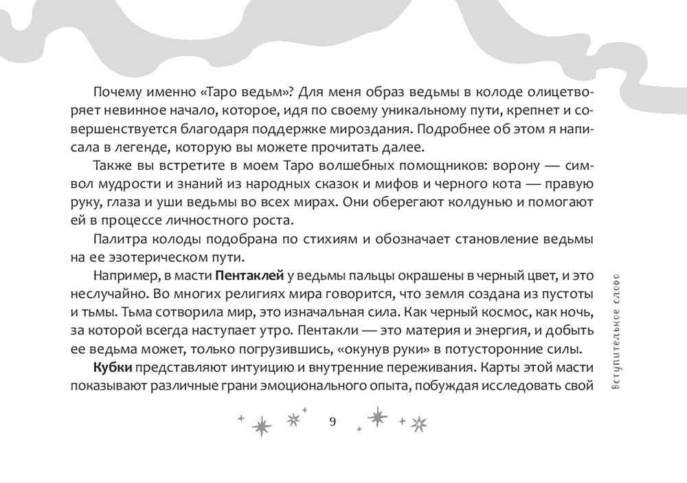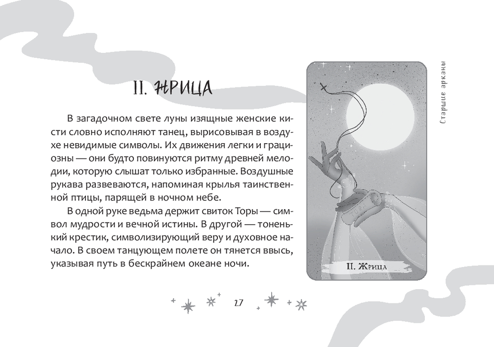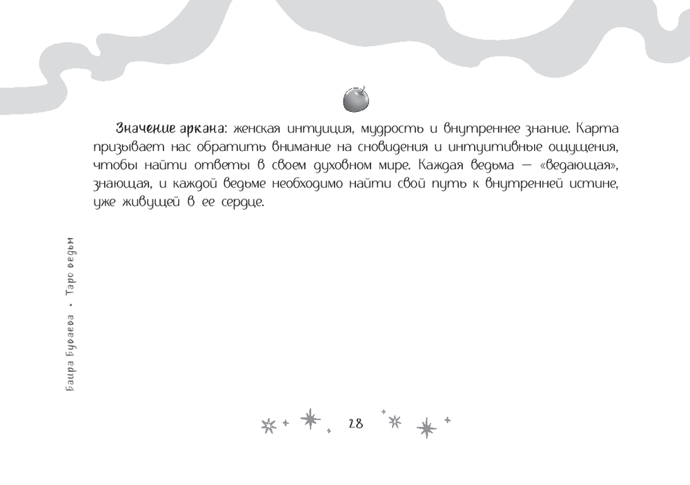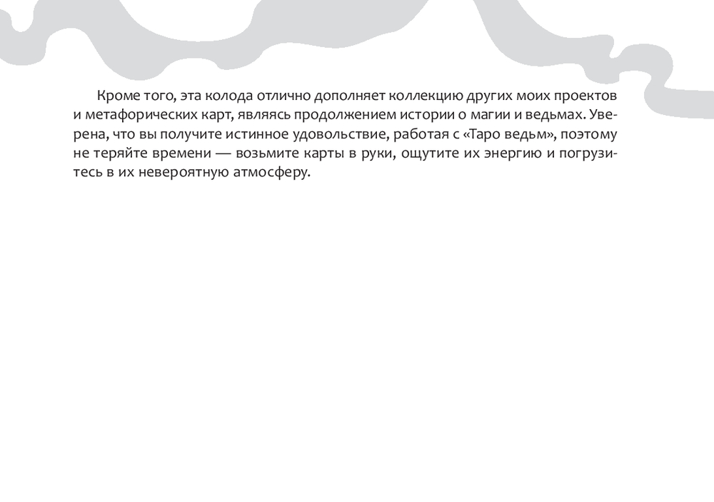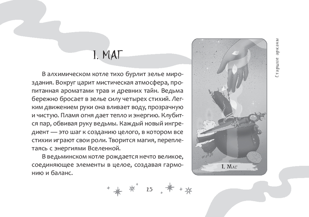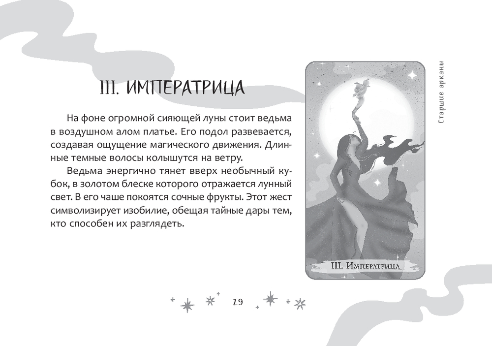 В этом Таро образ ведьмы представлен как архетип мудрости и силы. Ведьма здесь – не страшная фигура из сказки, а человек, идущий своим путем, чутко слышащий голос природных стихий и зов души. Ее путешествие начинается с раннего этапа, времени невинности, и в магическом странствии героиня приходит к зрелости, мастерству и внутренней свободе.