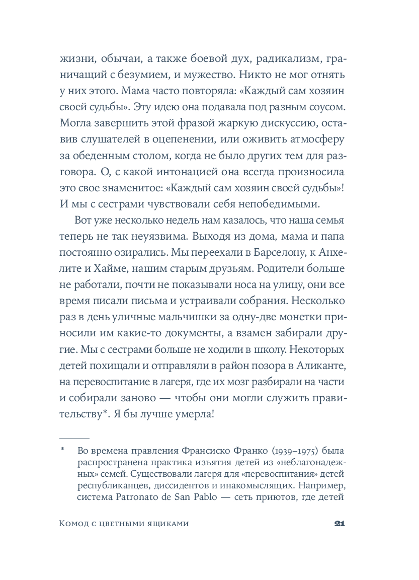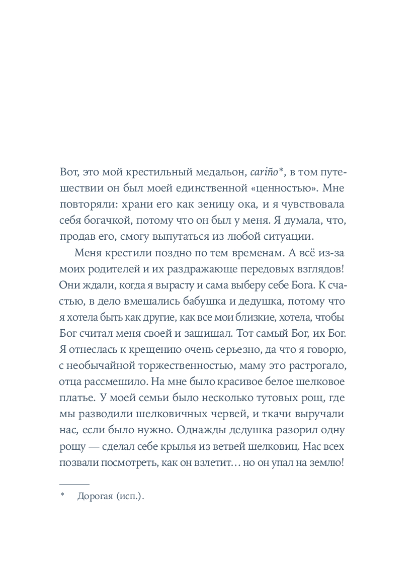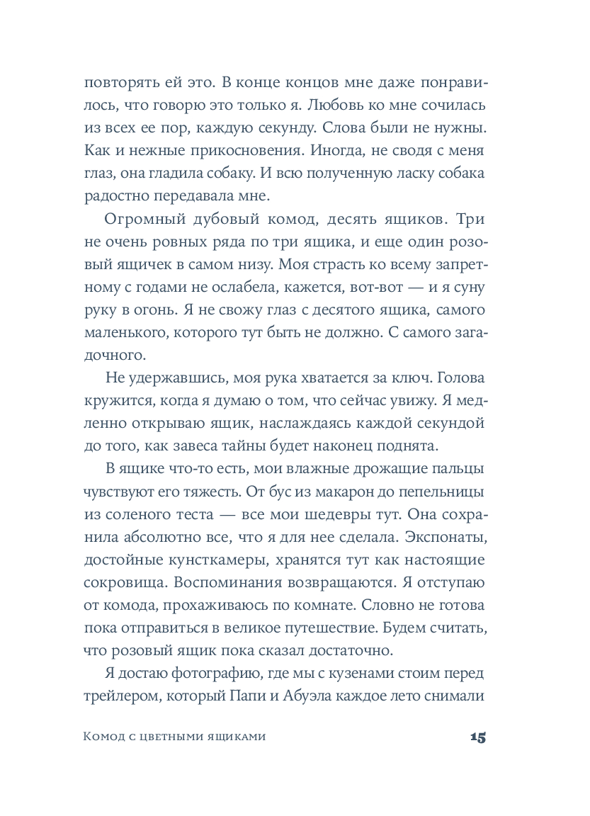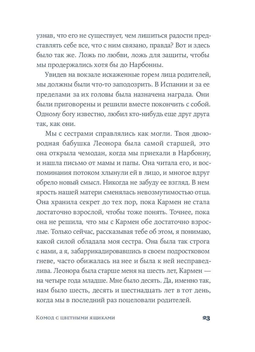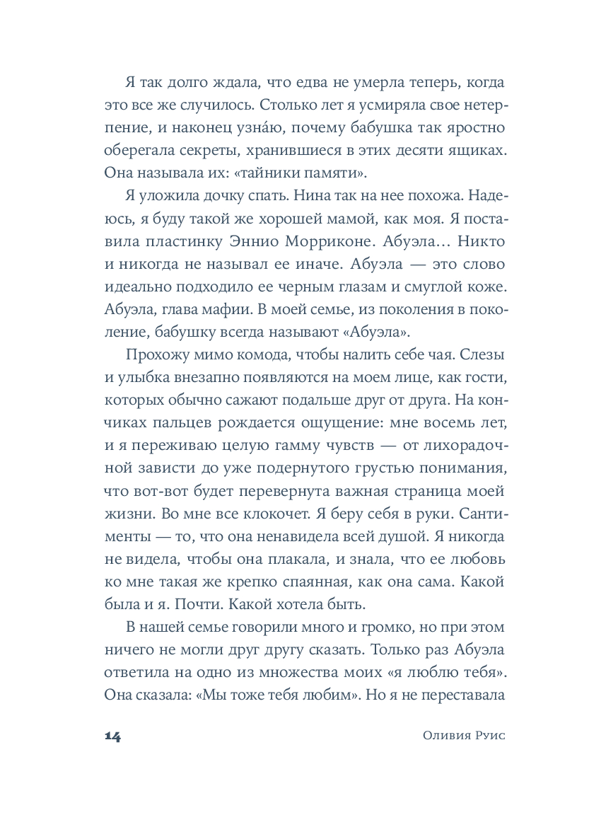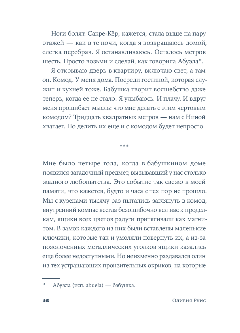 Крестильный медальон, тетрадь со стихами, билет на поезд... Каждый из этих предметов, спрятанных в старинном комоде, хранит память о жизни людей близких и далеких. За одну ночь героине предстоит повернуть все ключики в замках и узнать о судьбе своей семьи со времен Гражданской войны в Испании до наших дней. Вещи расскажут ей истории Риты, Леоноры и Кармен, которые находили силы любить, смеяться и надеяться, поднимаясь на ноги после каждого удара судьбы. Роман Оливии Руис, уже покоривший сотни тысяч читателей, – о том, как важно "знать, откуда мы пришли, чтобы узнать, куда мы идем".