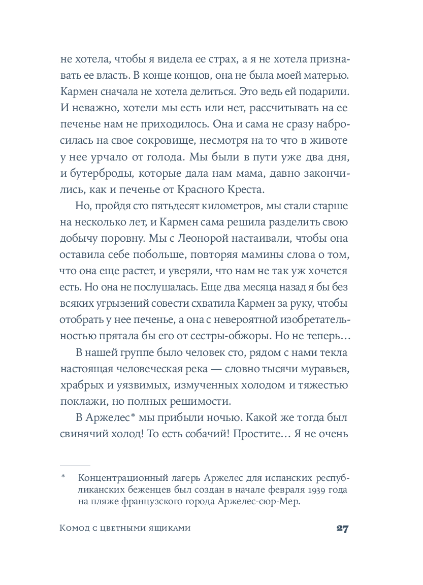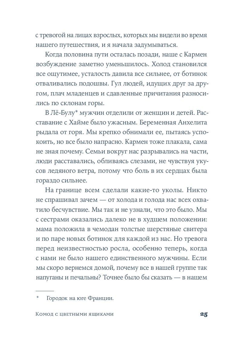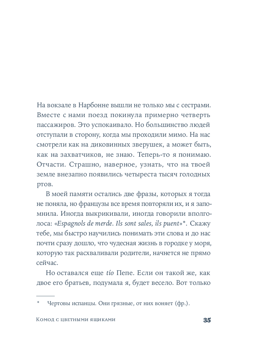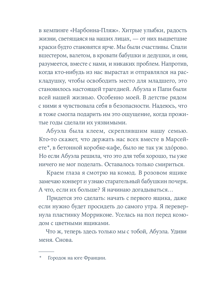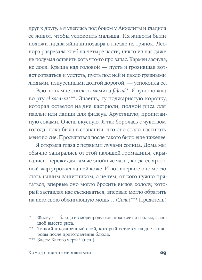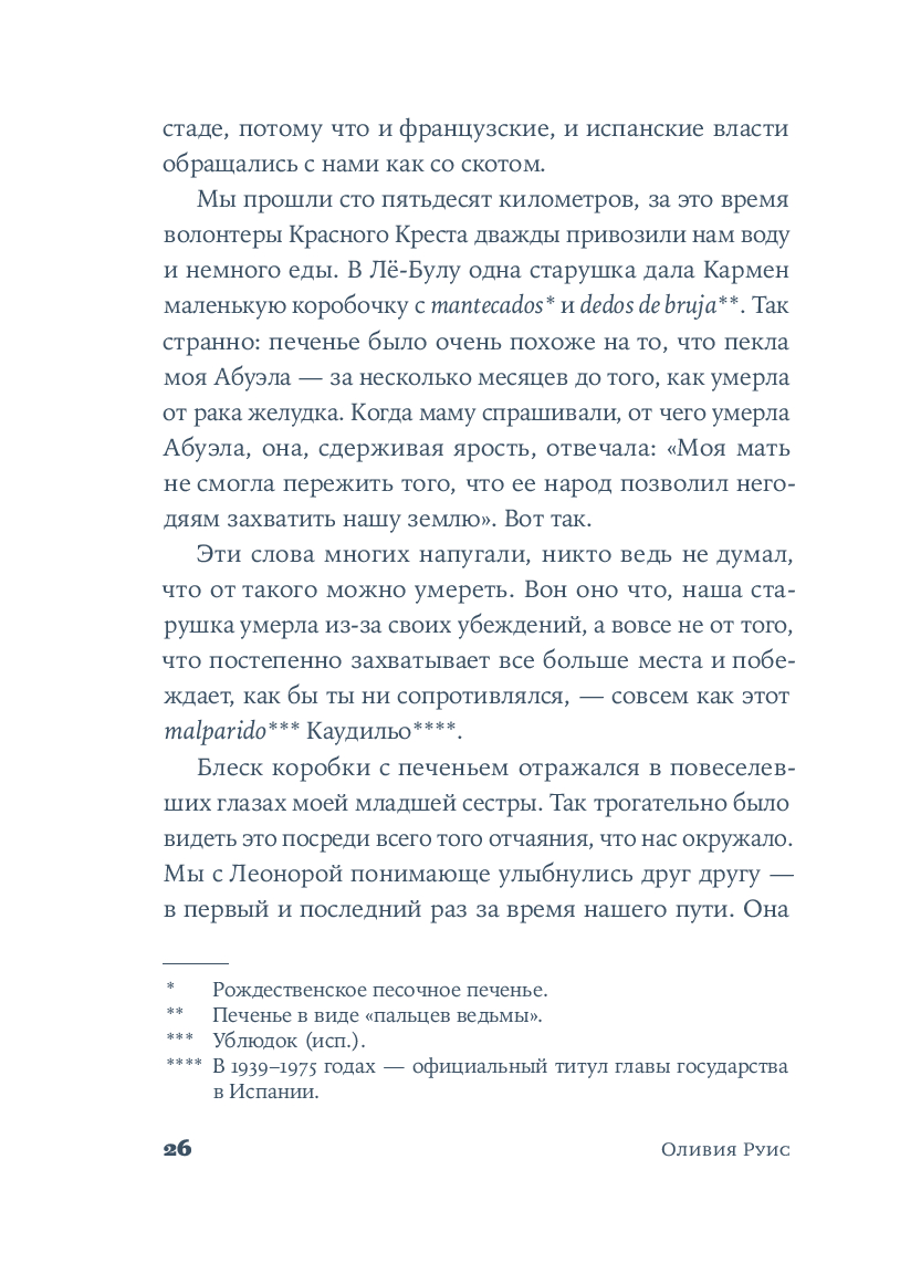 Крестильный медальон, тетрадь со стихами, билет на поезд... Каждый из этих предметов, спрятанных в старинном комоде, хранит память о жизни людей близких и далеких. За одну ночь героине предстоит повернуть все ключики в замках и узнать о судьбе своей семьи со времен Гражданской войны в Испании до наших дней. Вещи расскажут ей истории Риты, Леоноры и Кармен, которые находили силы любить, смеяться и надеяться, поднимаясь на ноги после каждого удара судьбы. Роман Оливии Руис, уже покоривший сотни тысяч читателей, – о том, как важно "знать, откуда мы пришли, чтобы узнать, куда мы идем".